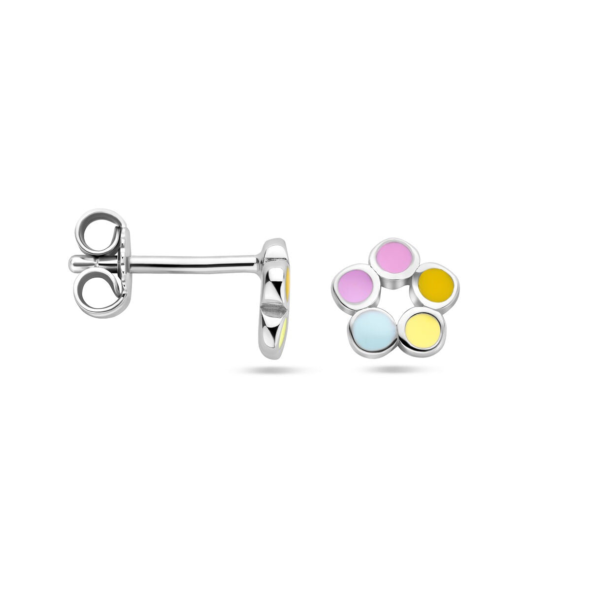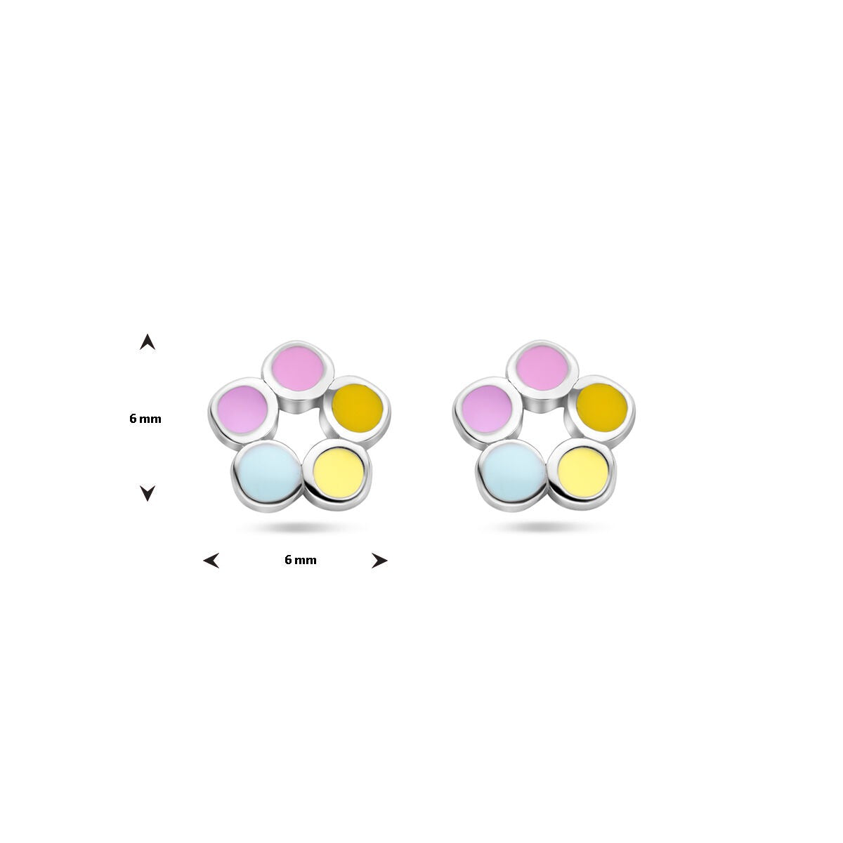 Deze speelse oorknoppen zijn vervaardigd van 925 sterling zilver en afgewerkt met een beschermende rodiumlaag, waardoor ze hun heldere zilverkleurige glans langdurig behouden. Het bloemvormige ontwerp is verrijkt met vrolijke emaille kleuren en straalt een frisse, kinderlijke charme uit. De zachte vormen en levendige tinten maken deze oorknopjes tot een geliefd sieraad voor jonge dragers.