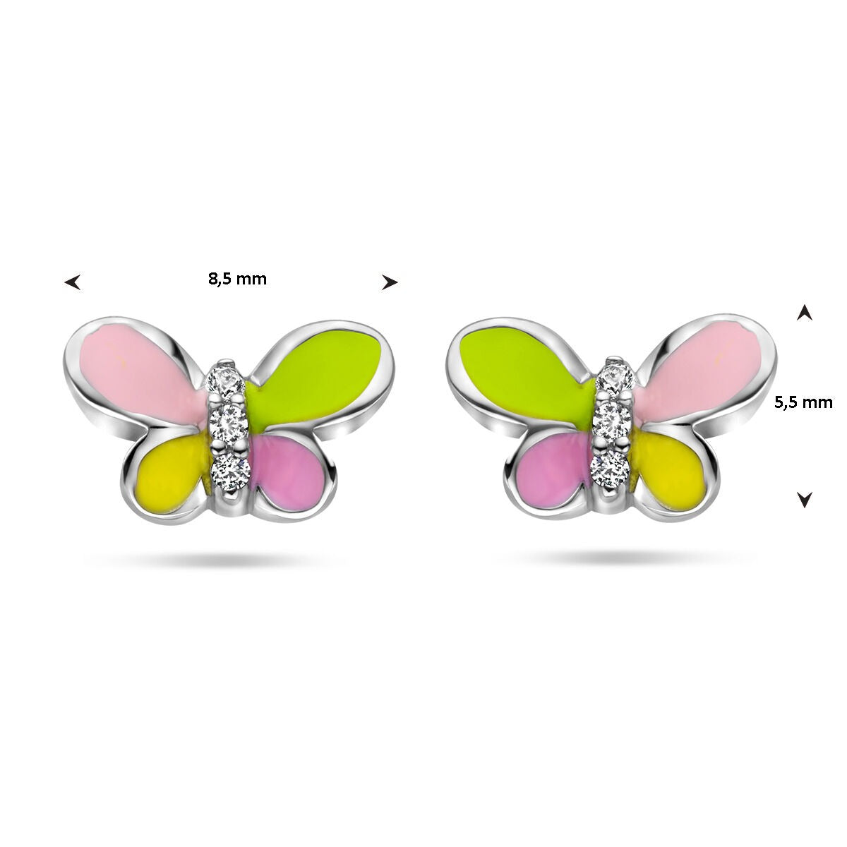 De vlinder is afgewerkt met zachte emaille kleuren, wat zorgt voor een levendig en vriendelijk uiterlijk dat perfect past bij jonge dragers. Dankzij het compacte en lichte ontwerp zijn de oorknoppen comfortabel om dagelijks te dragen. De poussettesluiting biedt een veilige en prettige bevestiging, zodat de oorbellen goed op hun plaats blijven tijdens het spelen en bewegen.