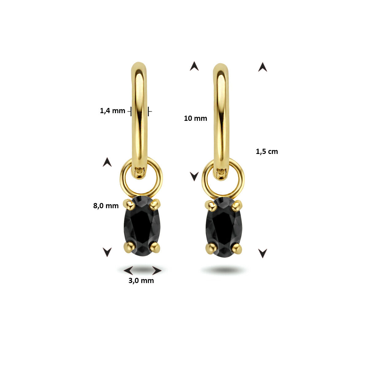 Ohrhänger aus 14-karätigem Gelbgold mit einem Anhänger, der einen wunderschönen schwarzen Zirkonia enthält. Die Ohrhänger haben einen Durchmesser von 10 mm und eine Dicke von 1,4 mm. Der Anhänger hat eine Größe von 8x3mm.