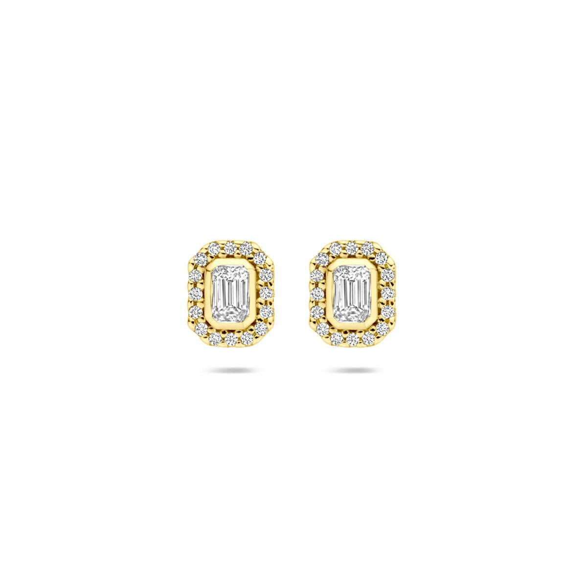 Deze gouden oorknoppen met diamant zijn een toonbeeld van klassieke luxe in een modern jasje. Vervaardigd uit 14 karaat geelgoud en bezet met emerald geslepen diamanten van in totaal 0.34 ct (SI1), stralen deze oorstekers een tijdloze elegantie uit. De rechthoekige vorm van de diamanten wordt subtiel omlijst door een entourage zetting, wat zorgt voor extra schittering en diepte.