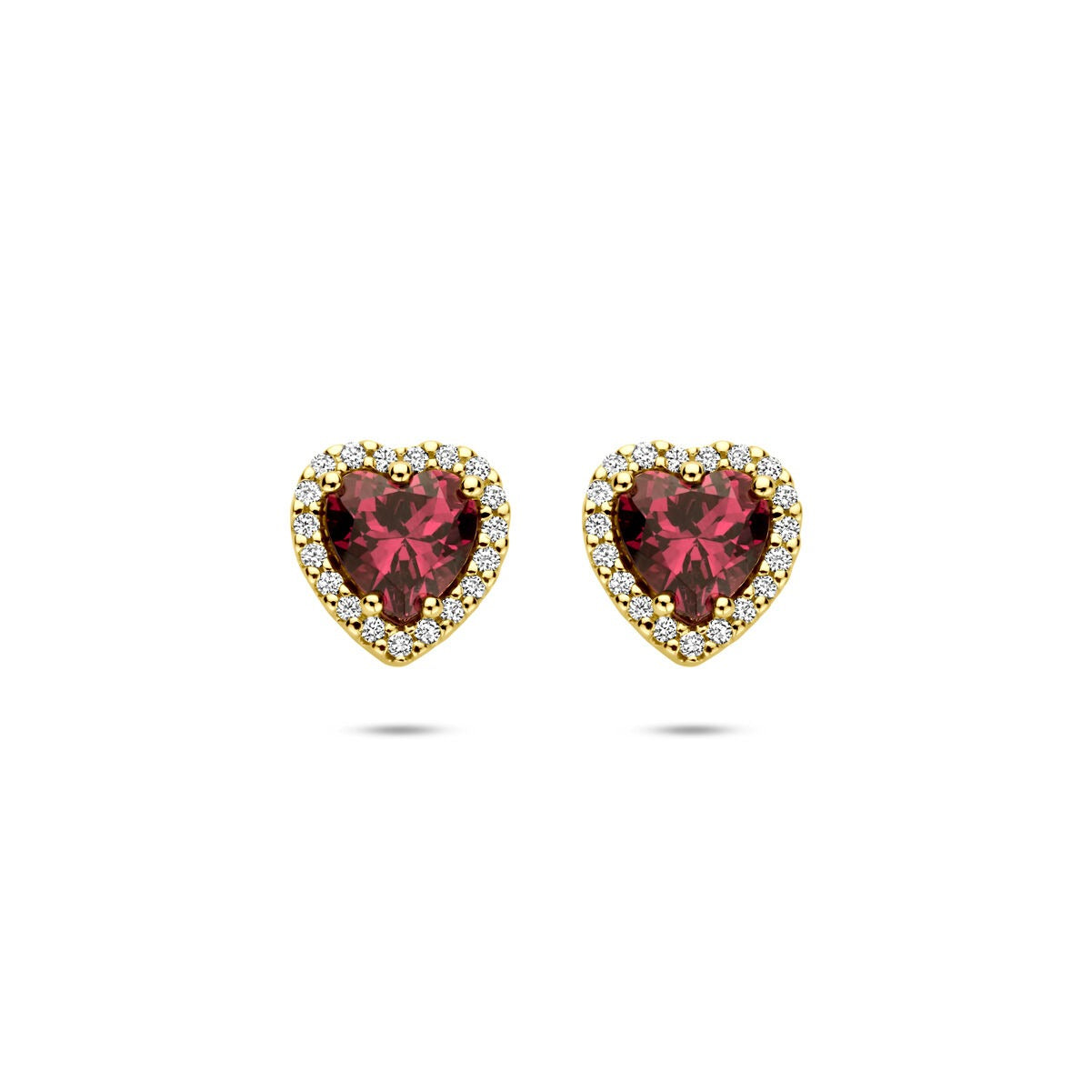 14k Geelgouden oorknoppen met Rhodoliet hartje en diamant – 0.10ct