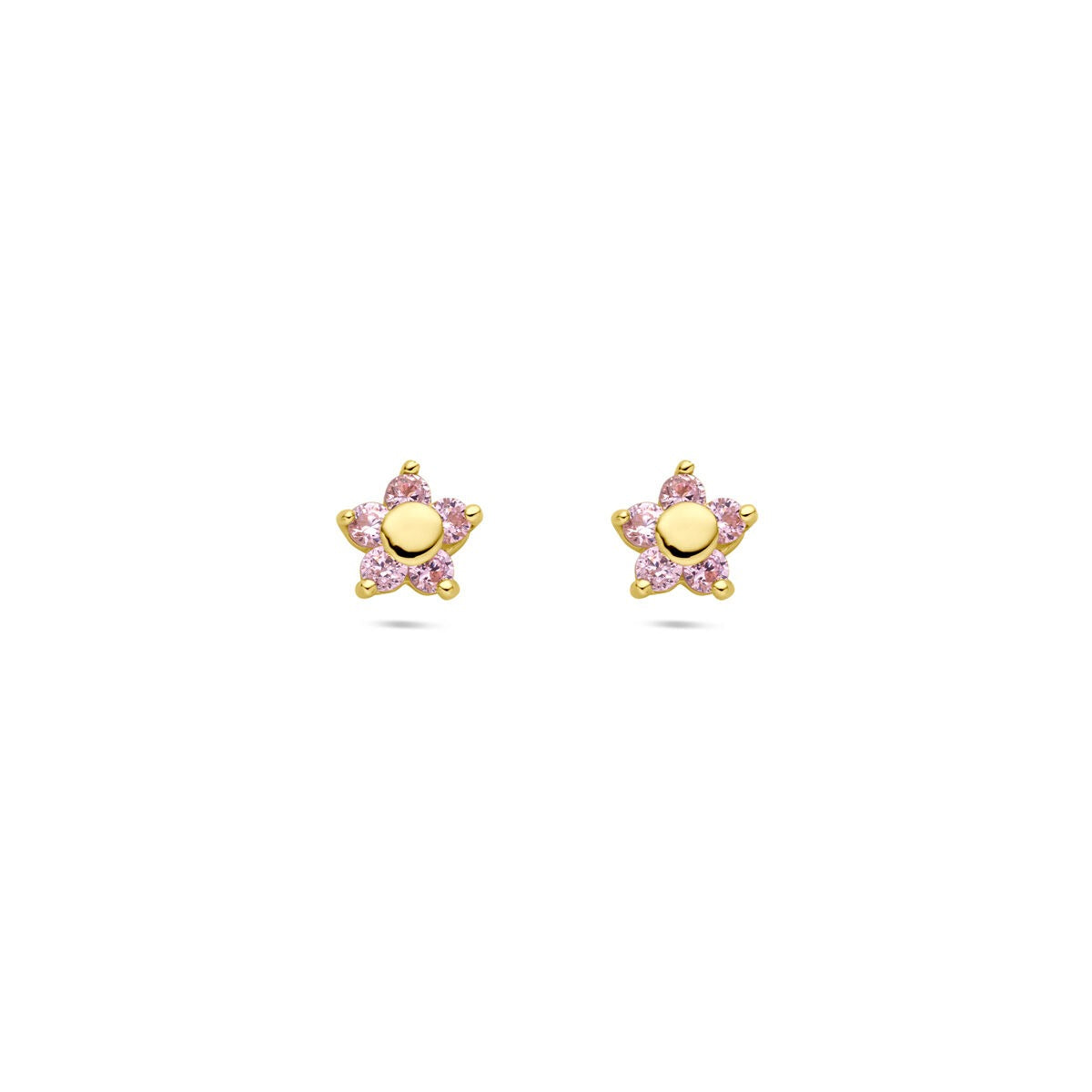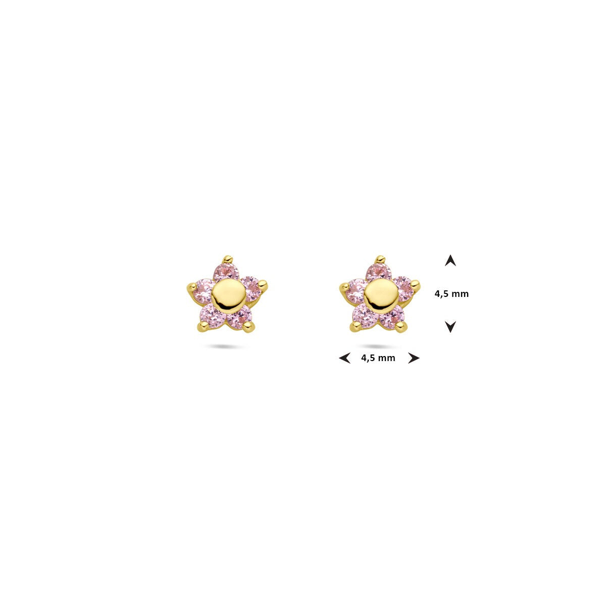 Ohrstecker aus 14-karätigem Gelbgold in Form einer Blume mit rosa Zirkonia. Die Ohrstecker haben eine Größe von 4,5x4,5mm.