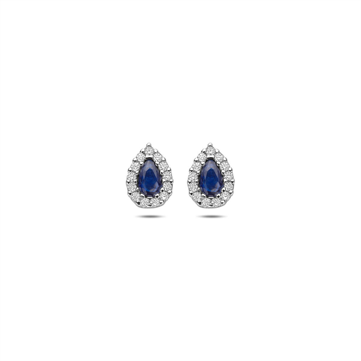 Deze verfijnde 925 zilveren oorknoppen brengen kleur en klasse samen in een elegant ontwerp. Het middelpunt wordt gevormd door een diepblauwe, peervormige saffier, schitterend omlijst door fonkelende zirkonia’s in een klassieke chatonzetting. De combinatie van blauw en transparant op het koele, gerhodineerde zilver zorgt voor een tijdloze en luxueuze uitstraling.