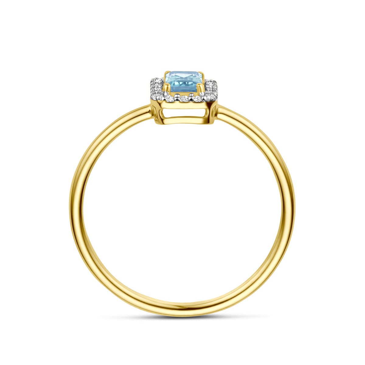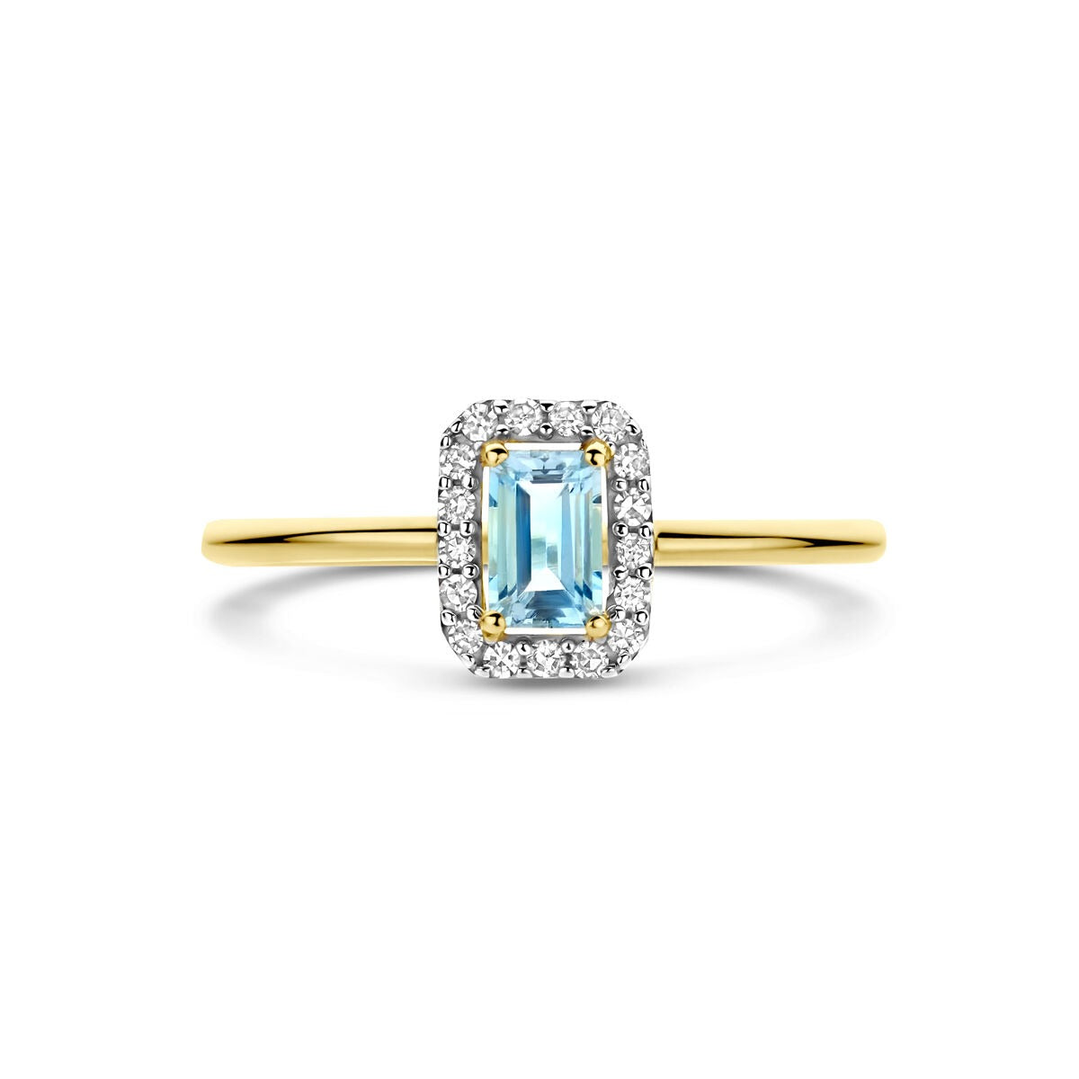 Gouden damesring met aquamarijn en diamant – 14k geelgoud