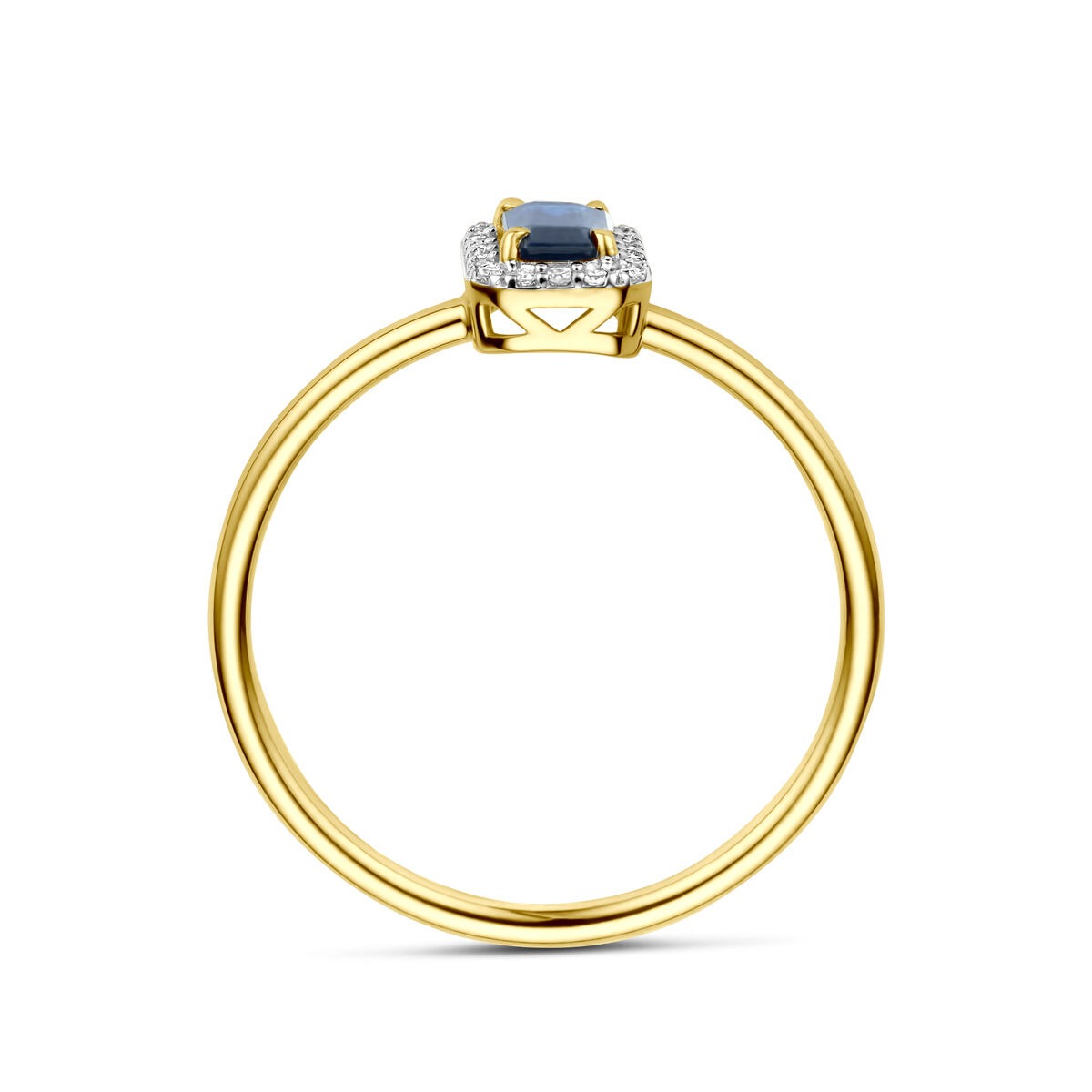 Een ring die klasse ademt in elk detail: deze 14 karaat geelgouden ring combineert de diepe, mysterieuze pracht van een saffier met de subtiele schittering van diamanten. Het centrale saffier heeft een elegante emerald slijpvorm en meet 7x5 mm – perfect in balans voor een verfijnde uitstraling. De steen is omringd door een fonkelende entourage van briljant geslepen diamanten (0.06 ct, SI1), die het geheel een klassieke, tijdloze allure geven.