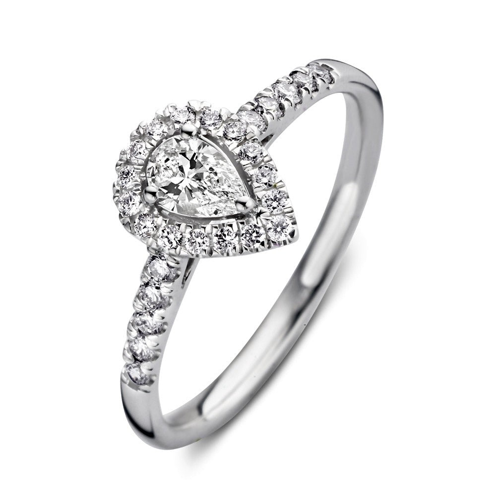 Een echte eyecatcher binnen de collectie is deze peervormige Elin ring! De fancy cut diamant is geslepen in peervorm en valt dan ook onmiddellijk op. De middensteen is bovendien omringd door kleinere briljant geslepen diamant voor een extra wauw-factor. Ook de scheen van de ring bevat fijne, fonkelende diamanten, wat de luxe uitstraling helemaal compleet maakt. De ring heeft een sierlijke verhoogde zetting, waardoor hij perfect gecombineerd kan worden met een gladde of diamanten rijring. Wat dacht je bijvoorbeeld van onze Millie ring?