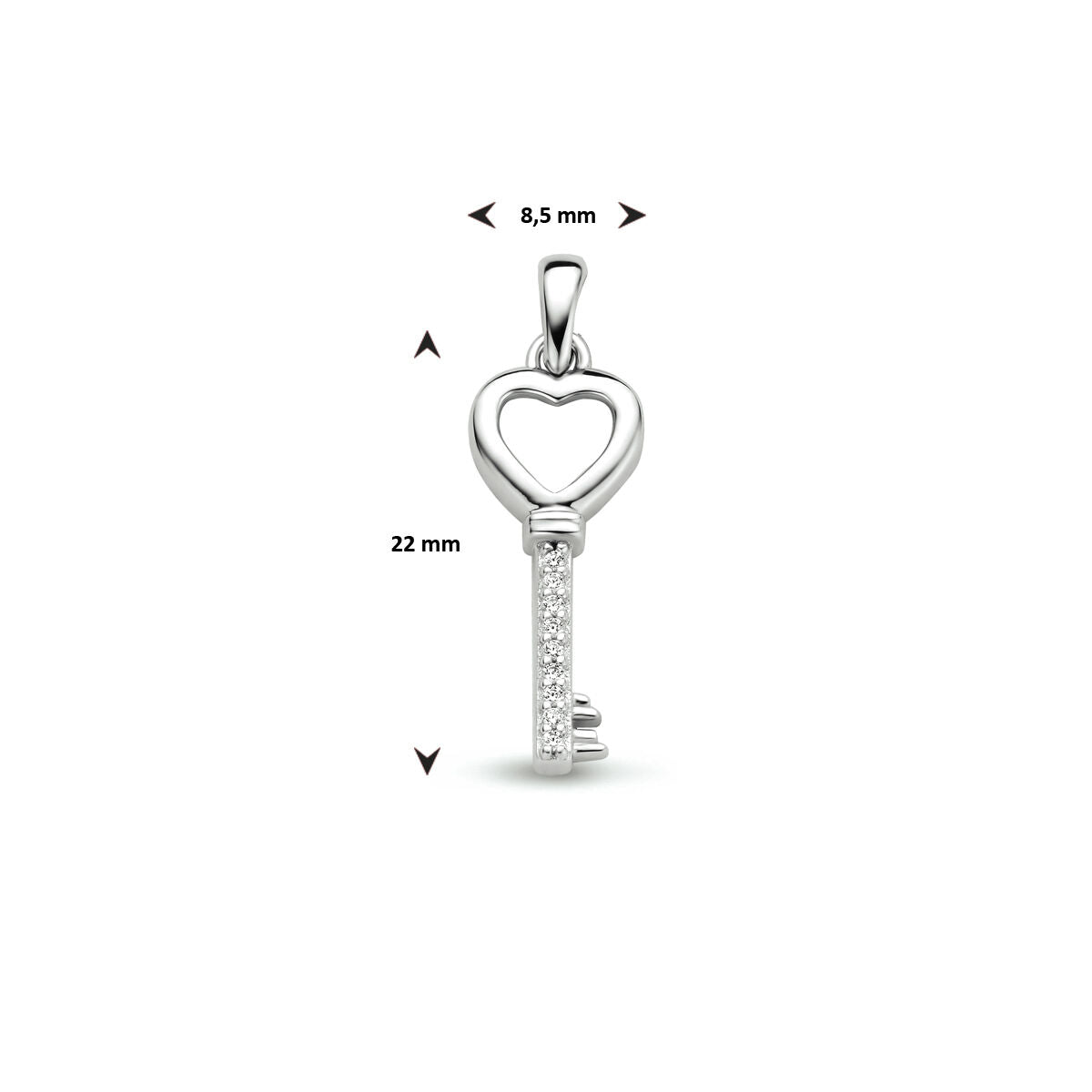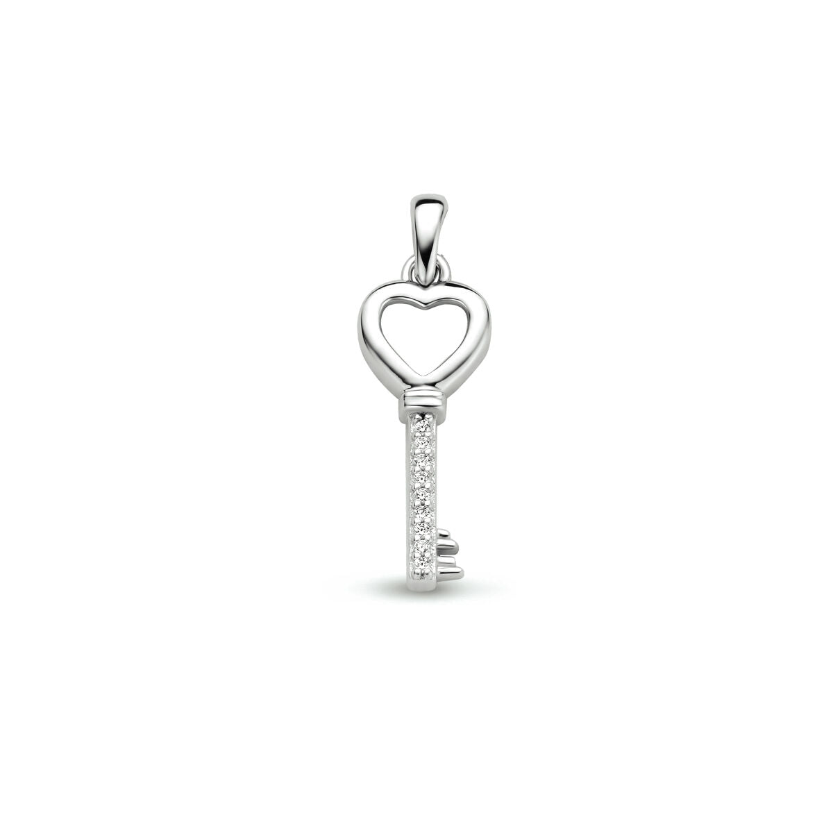 Rhodinierter 925er Silberanhänger in Form eines Schlüssels und mit einer wunderschönen Zirkoniareihe. Der Anhänger hat eine Gesamthöhe von 2,6 cm und eine Breite von 8,5 mm.