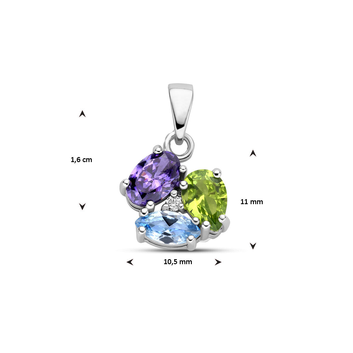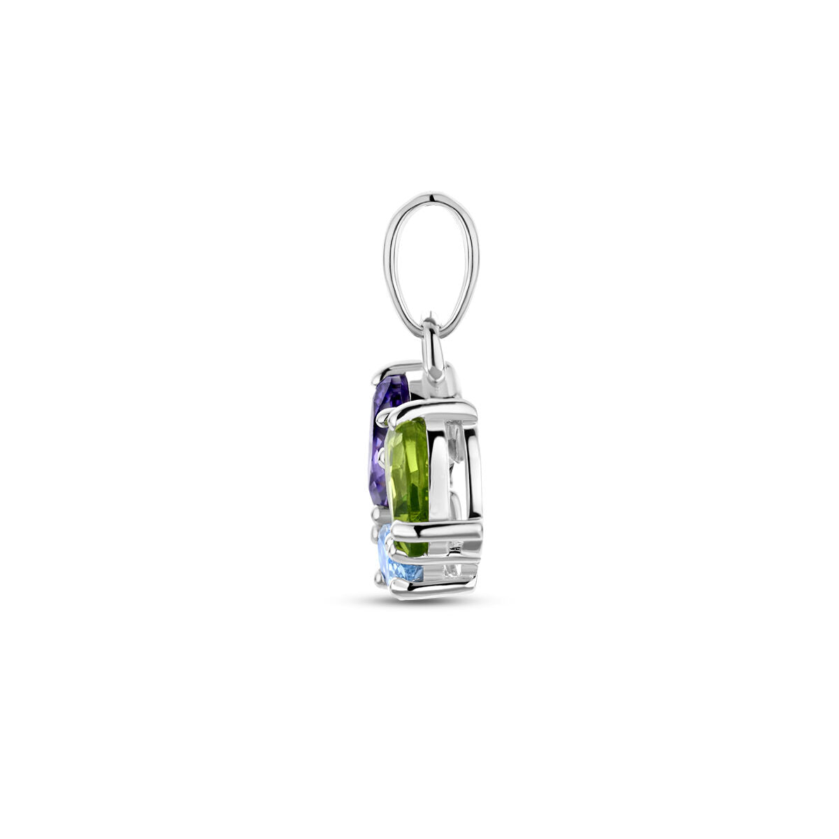 Rhodinierter 925er Silberanhänger mit vier Steinen: Zirkonia, Zirkonia Amethyst, Synth. blauer Spinell und Synth. Peridot. Der Anhänger hat eine Gesamthöhe von 16 mm.