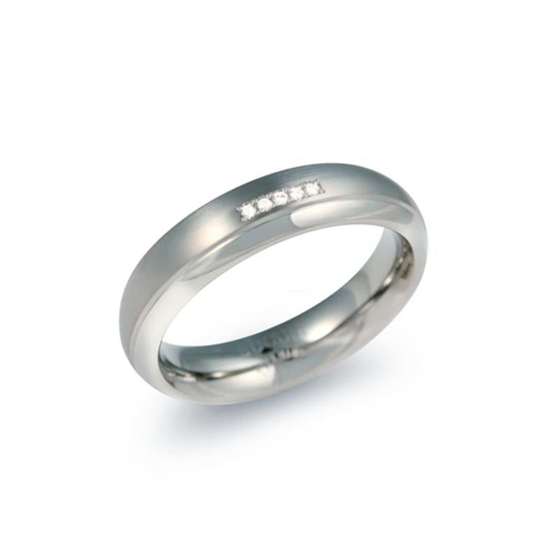 Dieser Titan-Damenring von Boccia Titanium hat sowohl einen mattierten als auch einen glänzenden Akzent und ist mit fünf handgefassten Diamanten ausgestattet. Die Diamanten (0,025 ct) sorgen bei diesem Schmuckstück für einen funkelnden Effekt. Der 0130-09 ist in mehreren Größen erhältlich, hat eine konvexe Innenseite und ist 5 mm breit. Kurz gesagt, ein elegantes und einzigartiges Accessoire!