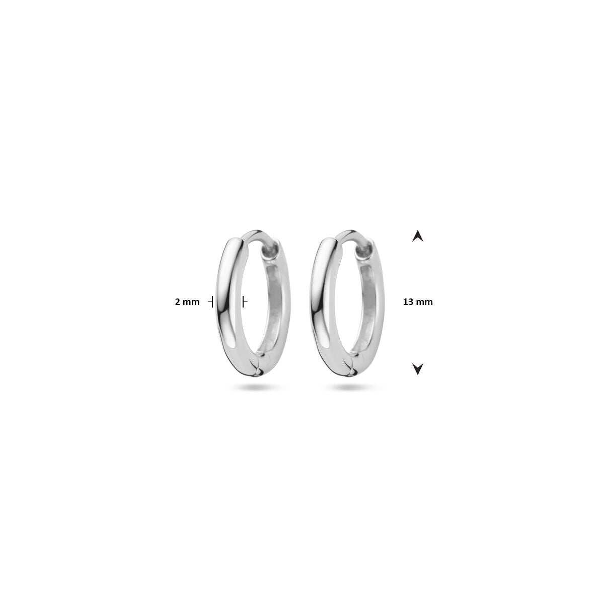 Een paar Van der Kooij Collectie zilveren gerhodineerd oorringen 2,0 mm voor oorringhangers wordt getoond op een witte achtergrond, met pijlen die de dikte van 2 mm en de diameter van 13 mm aangeven.