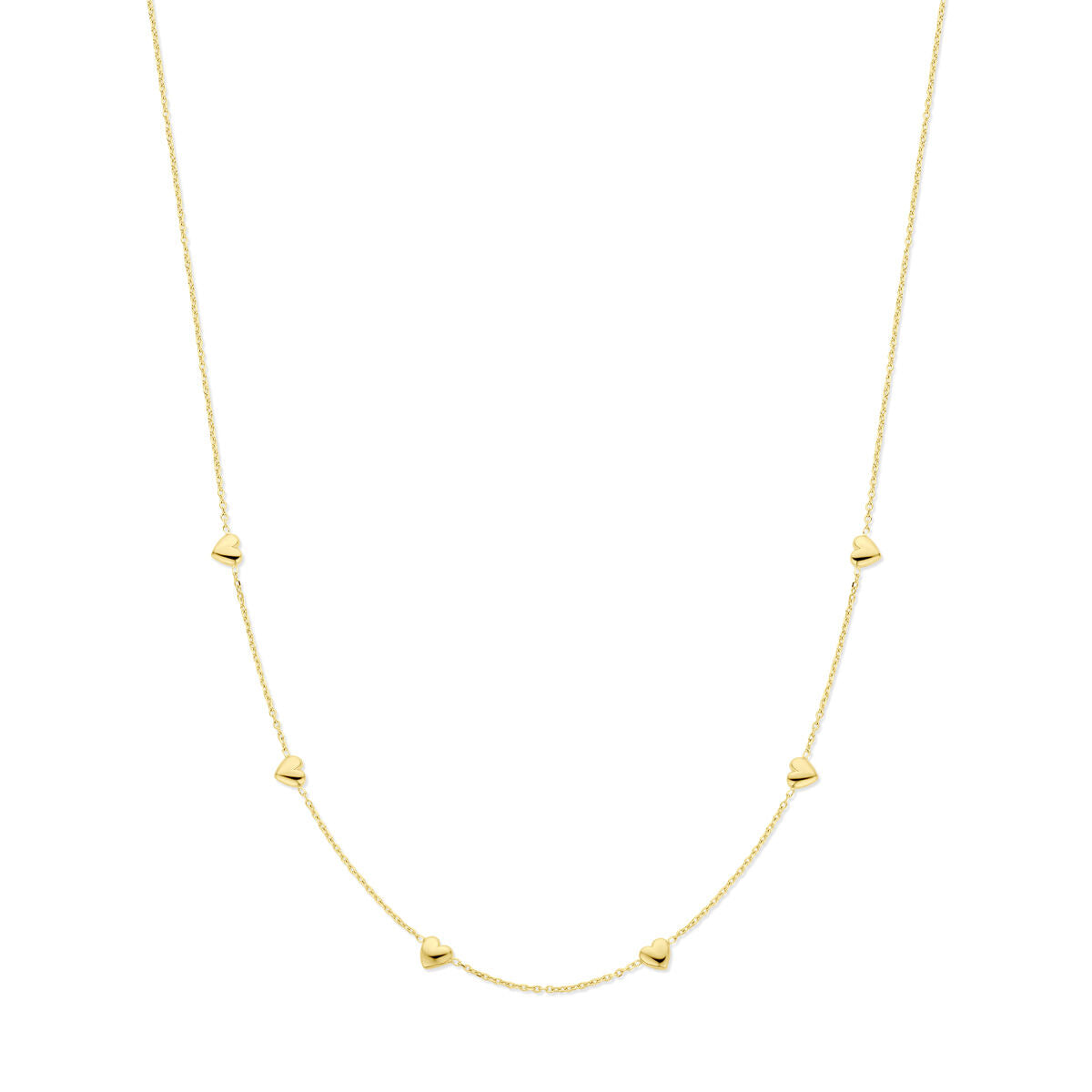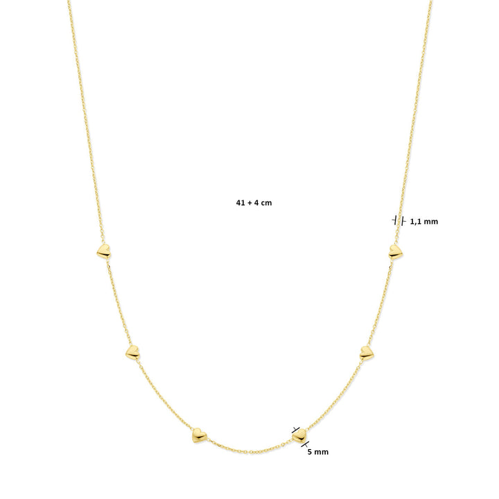 Halskette aus Gelbgold auf 925er Silber mit Herzen. Die Halskette hat eine Gliederbreite von 1,1 mm und eine Tragelänge von 41 cm mit 4 cm Verlängerung. Keine Garantie auf die Beschichtung.