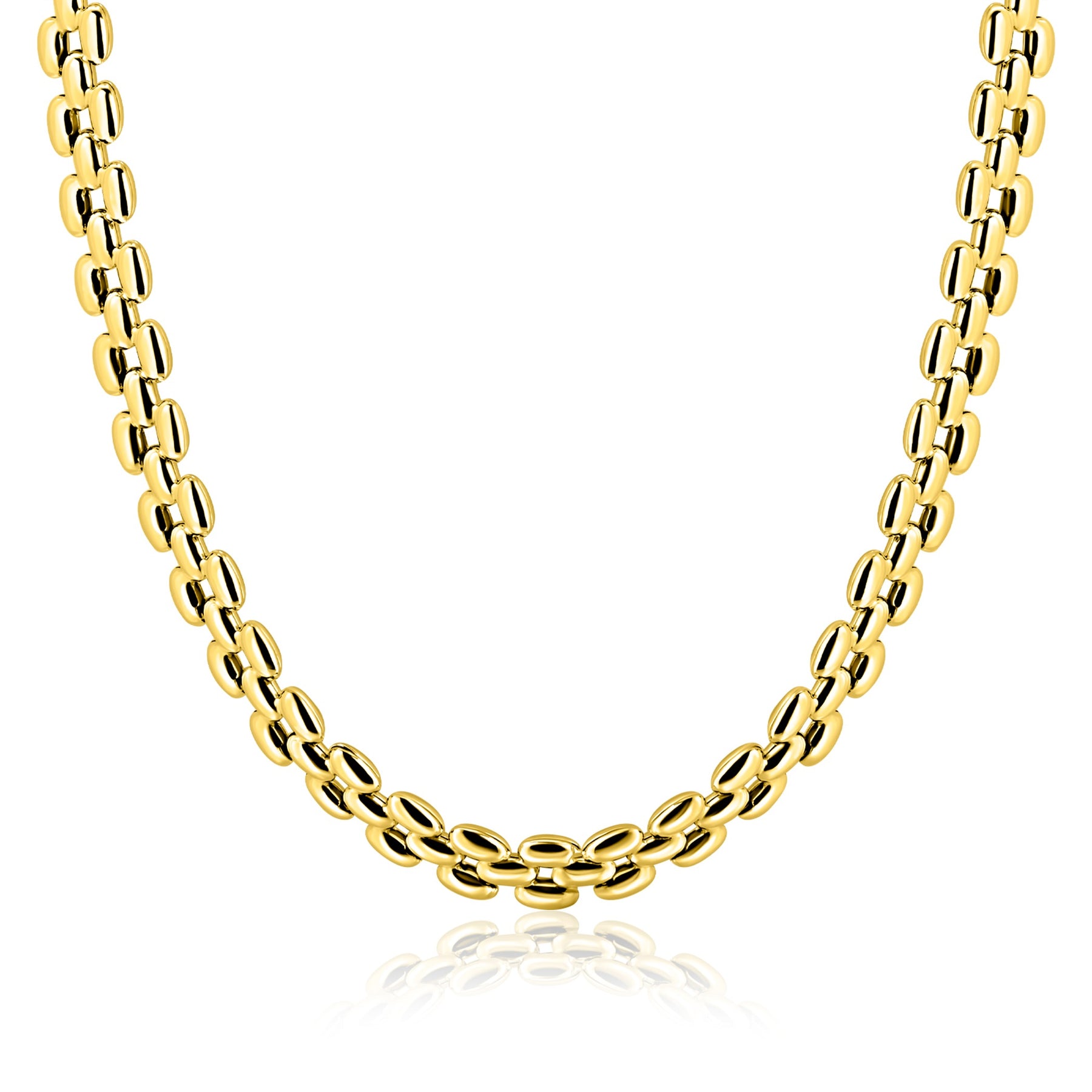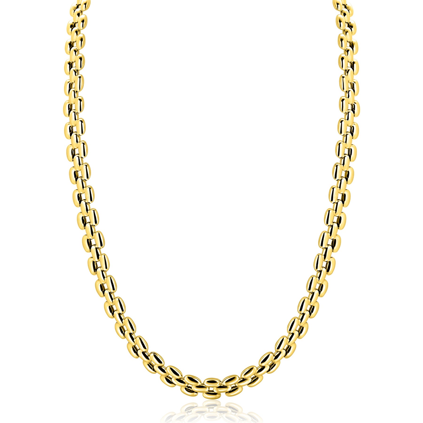 ZINZI gold plated zilveren brede rolex-style schakel-collier, de luxe schakels zijn 8mm breed. De lengte van het collier is 43cm. Het collier is vervaardigd van eerste gehalte zilver (925) en extra geel verguld.