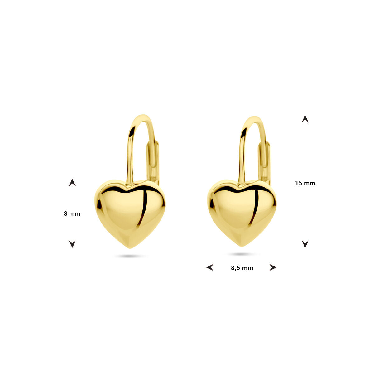 Ohrringe aus Gelbgold auf 925er Silber. Das Herz hat eine Größe von 8x8,5mm.