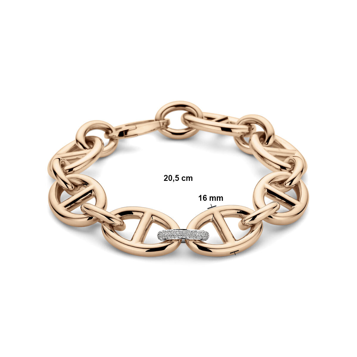 Armband aus 18-karätigem Bicolor-Rosé- und Weißgold mit Diamanten und Karabinerverschluss. Das Armband hat eine Tragelänge von 20,5cm. Die Gliederbreite beträgt 16mm.
