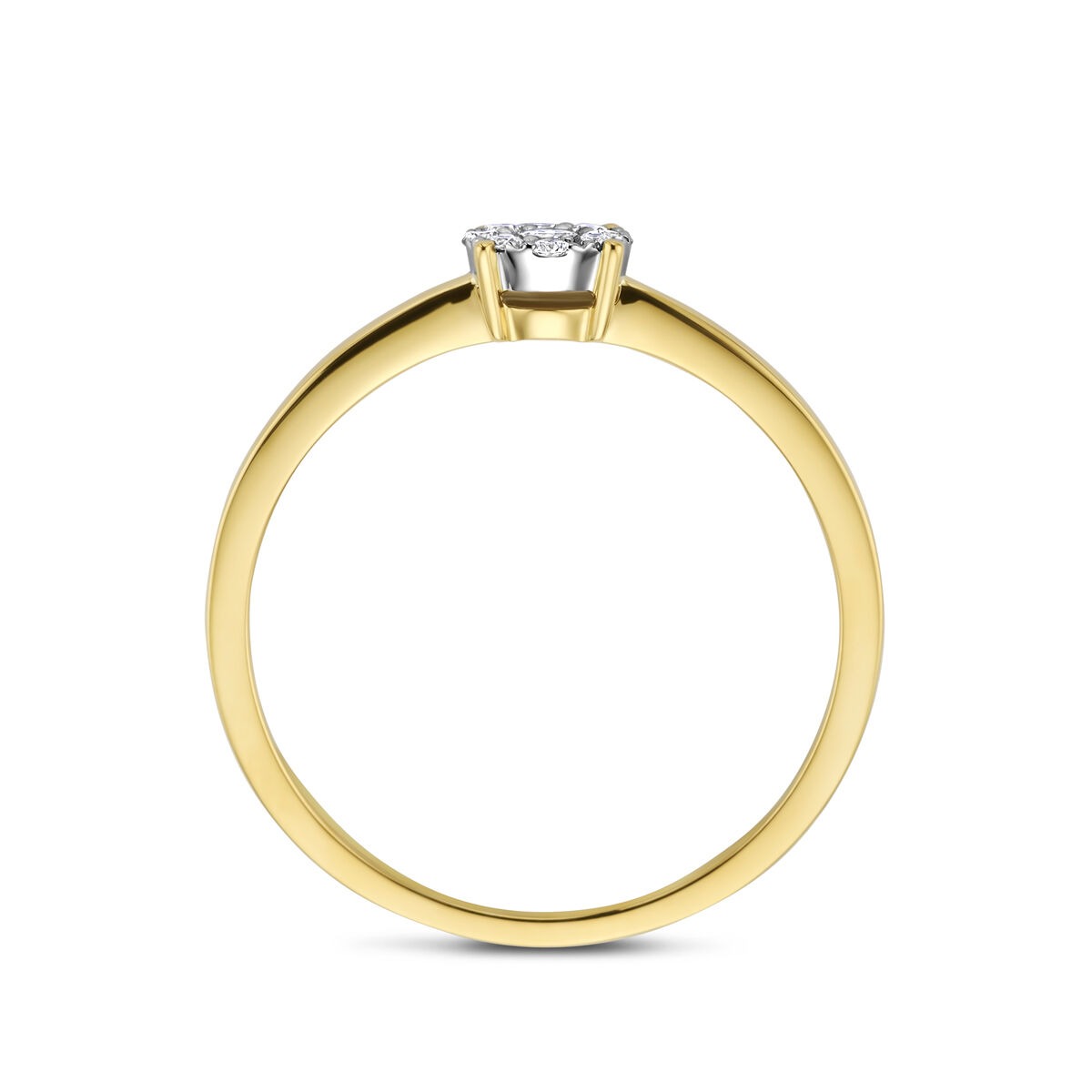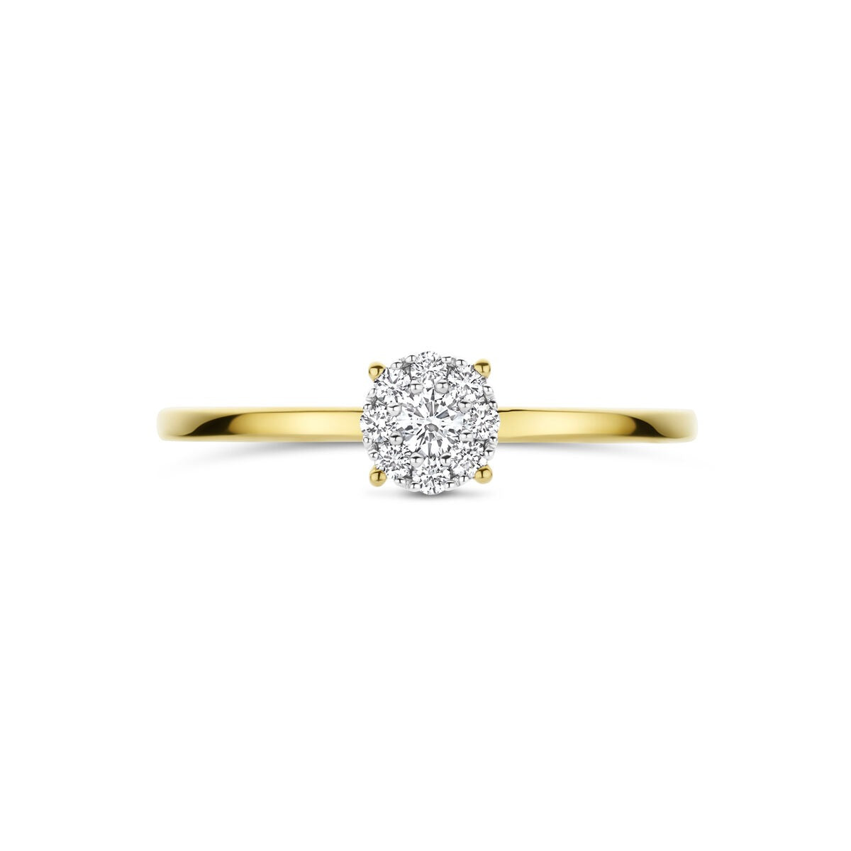 Deze elegante dames ring van 14k bicolor goud combineert de warmte van geelgoud met de verfijnde glans van witgoud in een harmonieus ontwerp. Centraal in de ring schittert een briljant geslepen diamant van 0.13 ct, omringd door een klassieke entouragezetting die het licht prachtig vangt en versterkt.