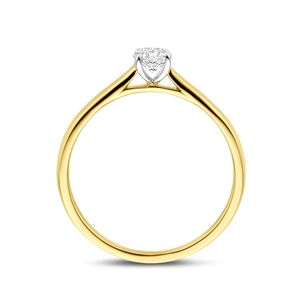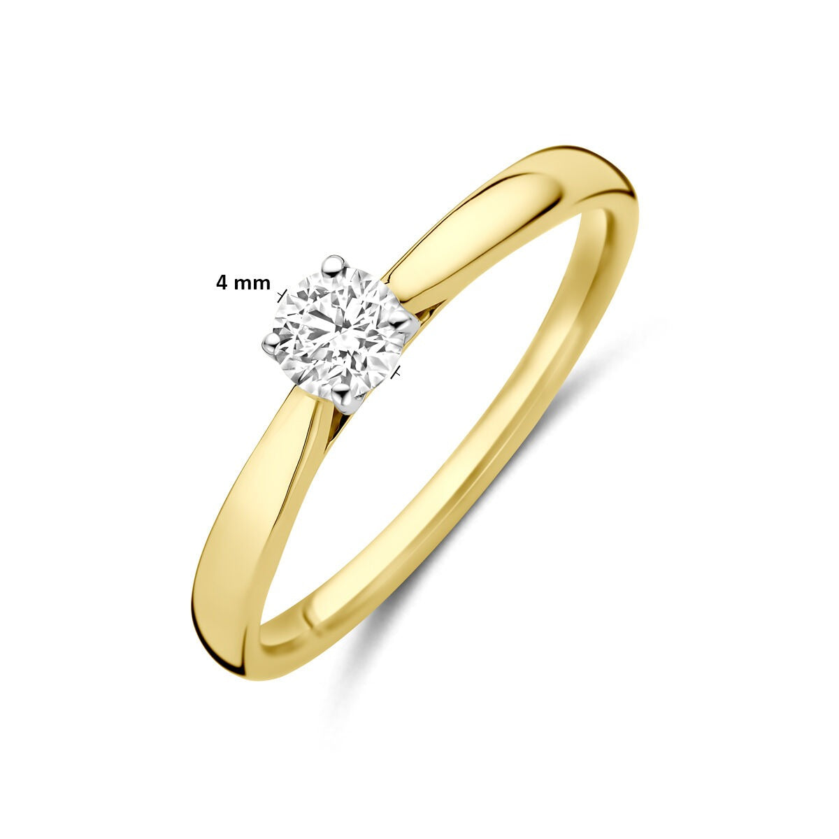 Deze verfijnde 14k bicolor ring is een elegante samensmelting van geel- en witgoud, ontworpen voor de vrouw die houdt van subtiele luxe met een eigentijdse twist. In het midden schittert een briljantgeslepen lab grown diamant van 0.25ct, met een diameter van 4 mm. De transparante steen met SI1-zuiverheid is vakkundig gezet in een klassieke 4-poots chatonzetting, waardoor de lichtinval prachtig wordt gevangen.