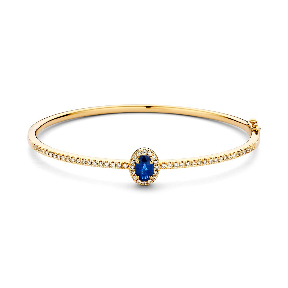 Stijlvolle, gouden bangle, aan de voorzijde gezet met diamanten. De eyecatcher is een ovaal geslepen saffier in fonkelende entouragezetting.