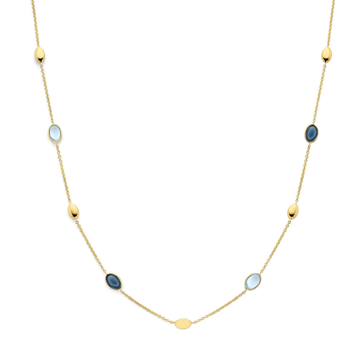 Met een schakelbreedte van 1,2 mm en een totale lengte van 45 cm valt dit sieraad elegant langs de hals. De karabijnsluiting biedt comfort en zekerheid, terwijl de combinatie van warme goudtonen met koelblauwe edelstenen zorgt voor een verfijnd contrast – perfect voor zowel alledaagse elegantie als feestelijke gelegenheden.