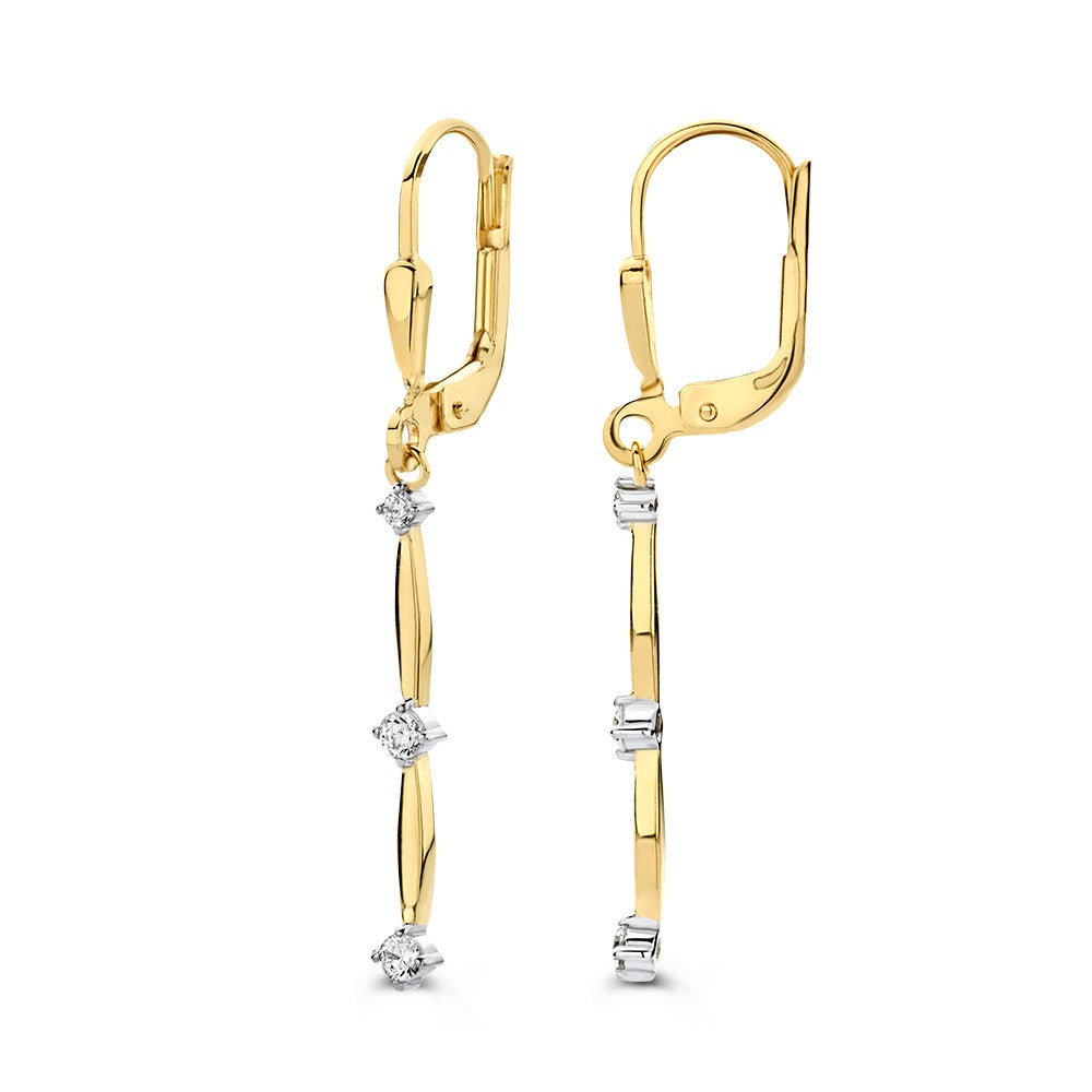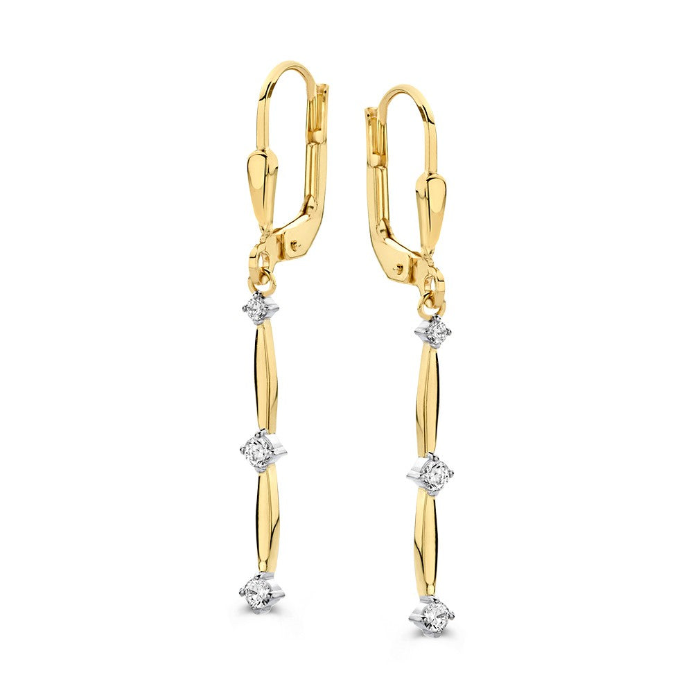 Geelgouden oorhaken met lange oorbedels gezet met zirkonia's.