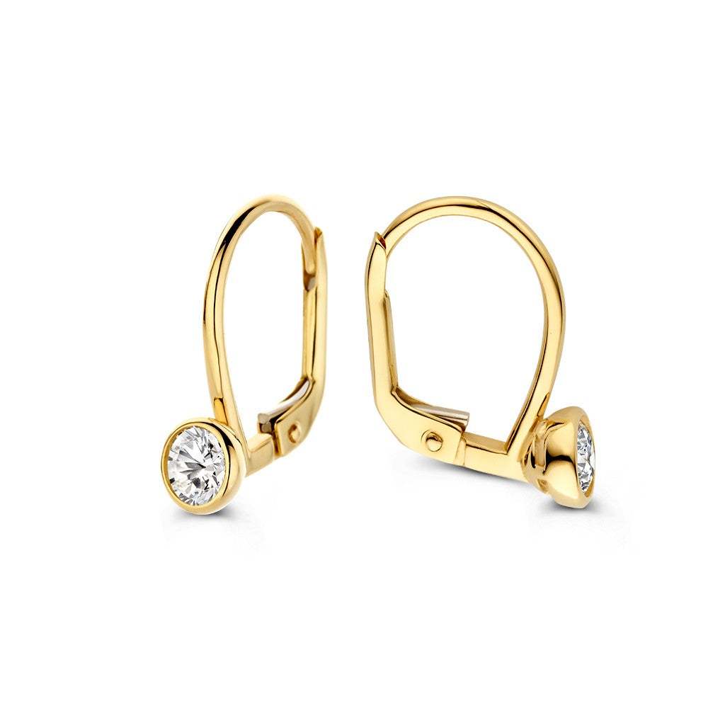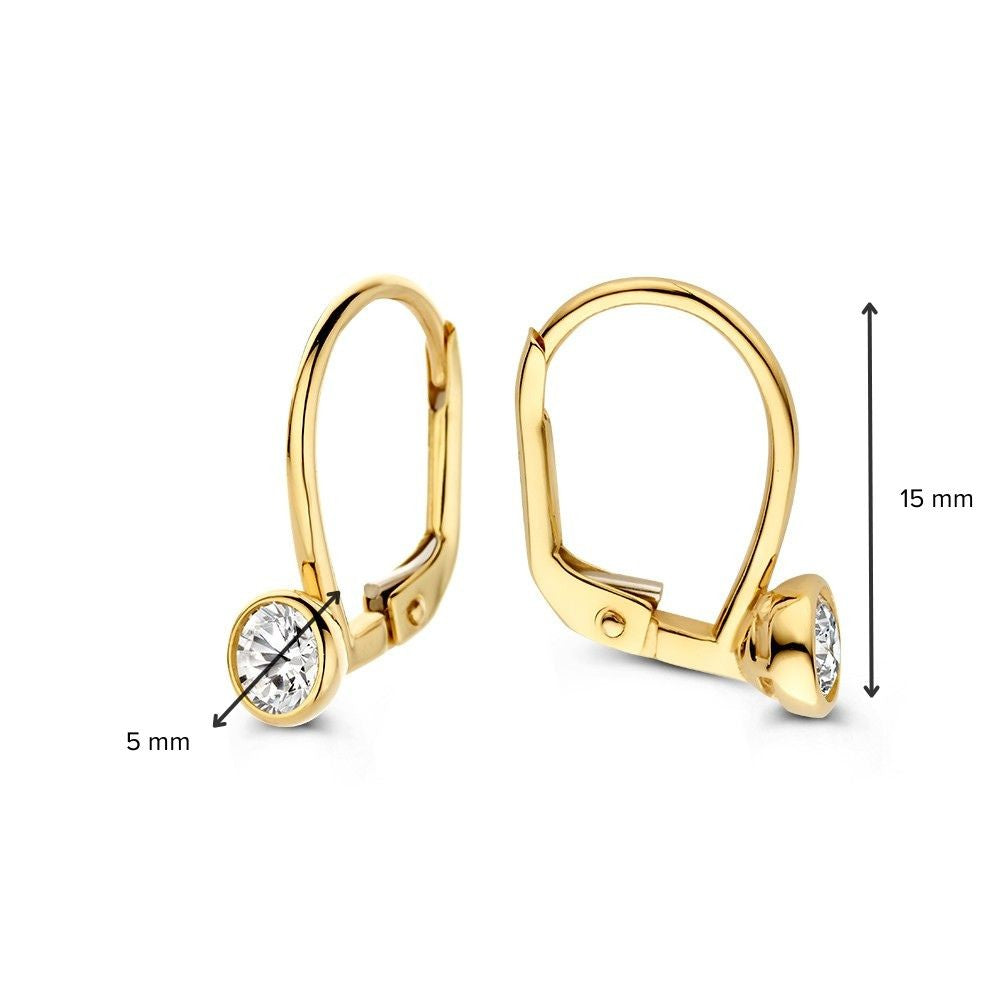 Voeg een vleugje elegantie toe aan je sieradencollectie met deze gouden oorhaken, gemaakt van 14 karaat geelgoud. De oorbellen zijn voorzien van sprankelende zirkonia's die vakkundig zijn gezet in ronde zetkastjes, waardoor ze prachtig reflecteren in het licht. De subtiele maar verfijnde uitstraling maakt ze geschikt voor zowel dagelijkse looks als speciale gelegenheden.