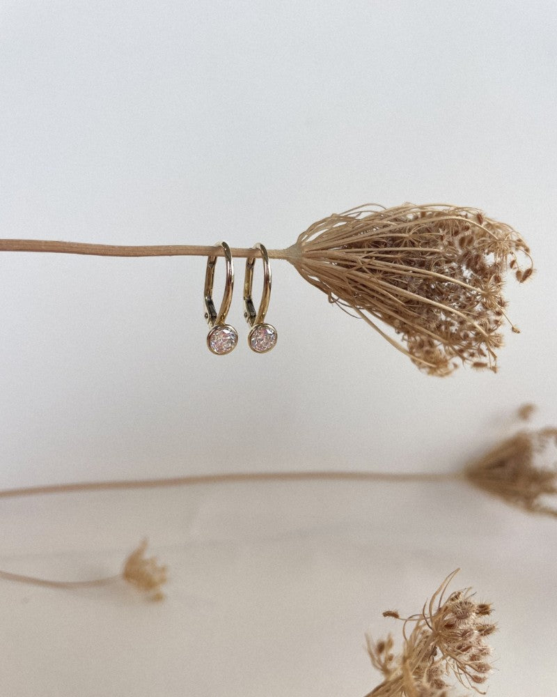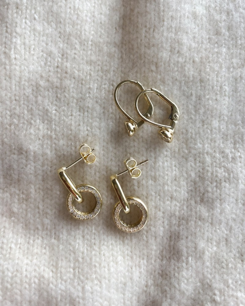 Gouden oorhaken met zirkonia's in ronde zetkast.