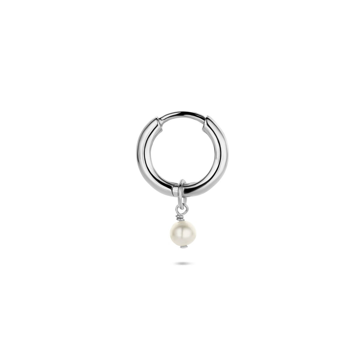 Deze gerhodineerd zilveren oorring met parel straalt ingetogen elegantie uit en is een tijdloze toevoeging aan elke sieradencollectie. De oorring is vervaardigd uit 925 zilver en voorzien van een glanzende rhodiumlaag, die niet alleen de schittering versterkt, maar ook bescherming biedt tegen verkleuring. De witte parel – klassiek bolvormig – hangt subtiel onder de oorring en voegt een verfijnd, vrouwelijk accent toe.