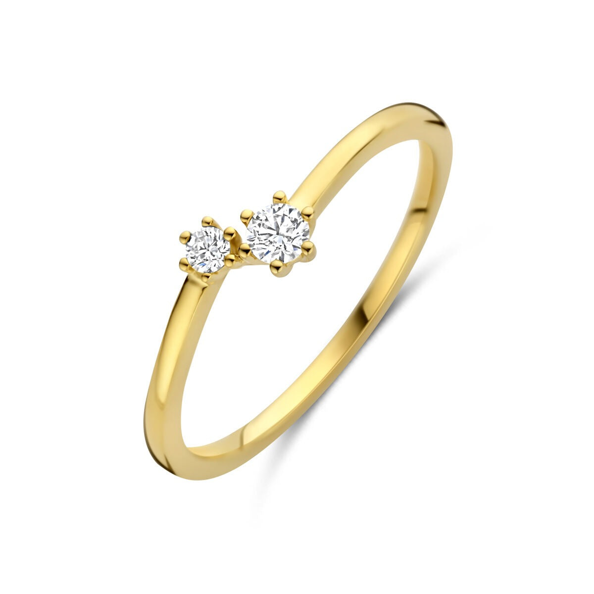 Deze verfijnde gouden dames ring met diamant is een klassieker met een moderne twist. Vervaardigd uit 14 karaat geelgoud en gezet met een schitterende briljant geslepen diamant van 0,11 ct, combineert dit sieraad elegantie met kracht. De diamant, met een diameter van 3,5 mm en zuiverheid SI2, is stijlvol geplaatst in een zes-poots chatonzetting, waardoor de steen stevig is verankerd én optimaal tot zijn recht komt.