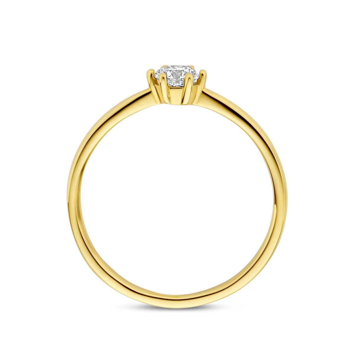 Deze stijlvolle gouden dames ring met lab grown diamant is een eigentijdse klassieker, ontworpen voor de vrouw die kiest voor duurzame schoonheid met karakter. In het midden schittert een briljant geslepen lab grown diamant van 0.25 ct, met een zuiverheid van VS2, prachtig geplaatst in een elegante zes-poots chatonzetting.