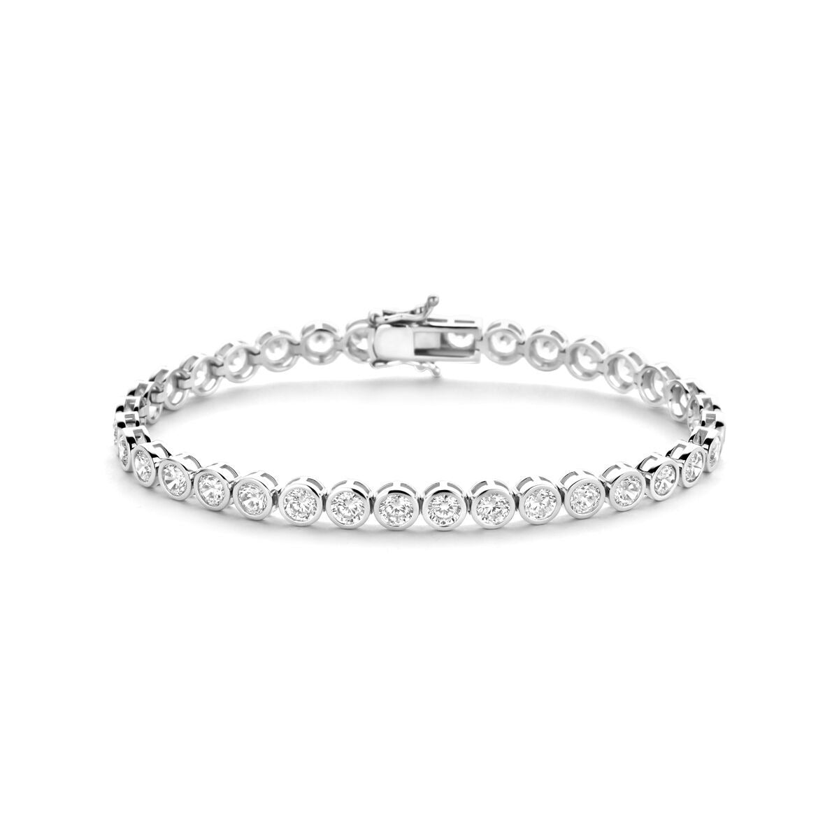 Deze schitterende gerhodineerd zilveren tennisarmband is een echte blikvanger, dankzij de royale schakelbreedte van 5,3 mm en de briljant geslepen zirkonia’s van 4 mm in diameter. De stenen zijn in een verfijnde alliance-rijzetting geplaatst, waardoor ze naadloos in elkaar overlopen en zorgen voor een sprankelend geheel dat luxe en elegantie uitstraalt.