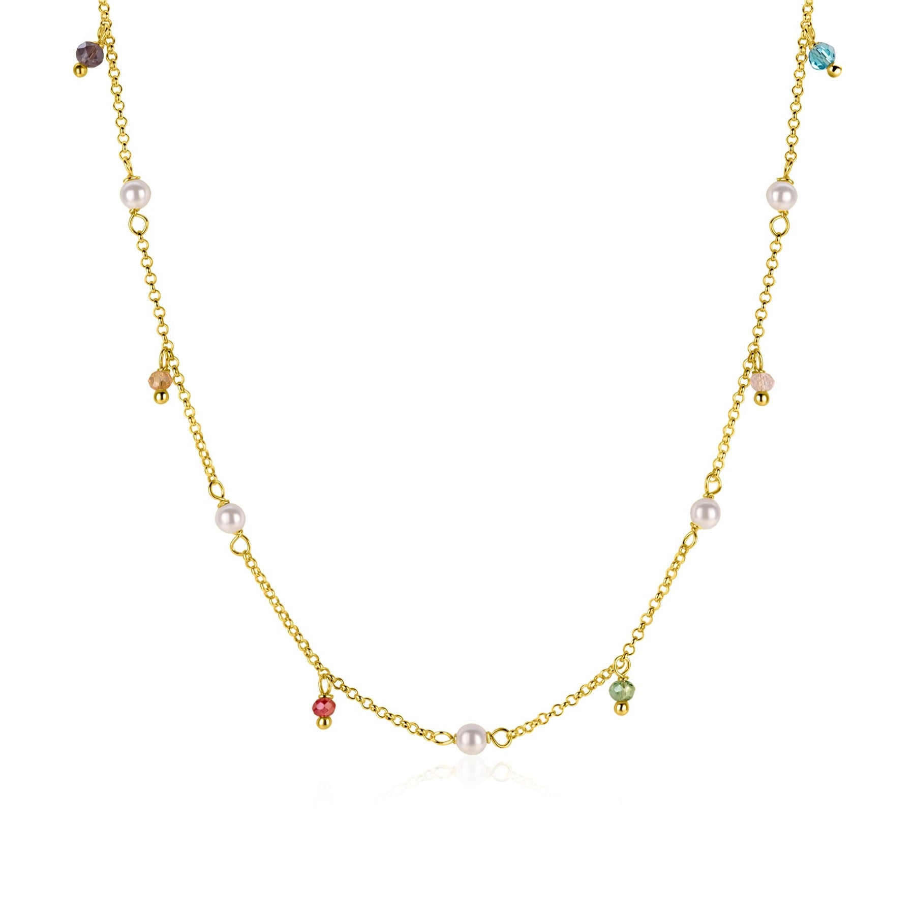 ZINZI gold plated zilveren ketting met afwisselend witte parels en bungelende facetgeslepen beads (5,5mm) in frisse kleuren. De ketting is verstelbaar van 42cm tot 45cm. Vervaardigd van eerste gehalte zilver (925) en extra geel verguld.