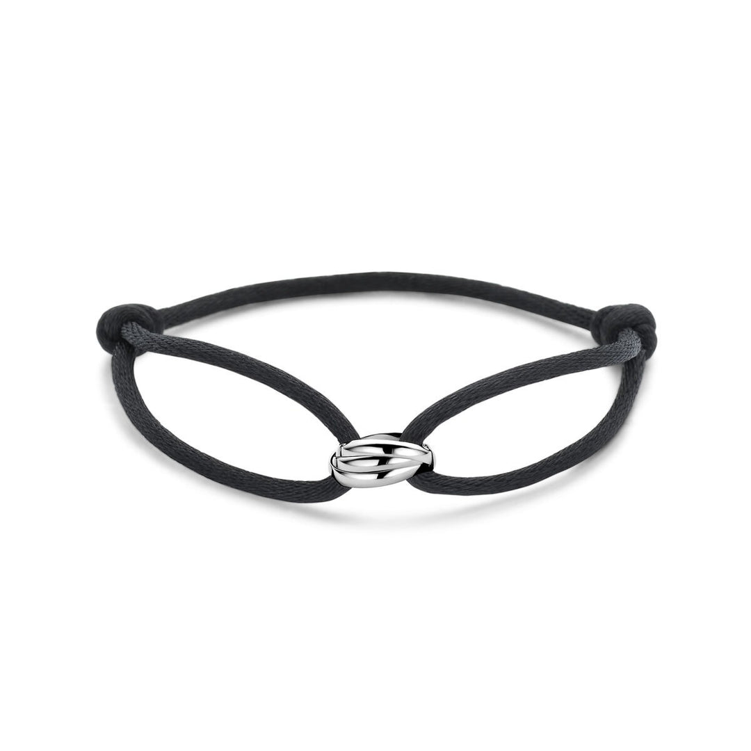 Zwart gevlochten damesarmband met drie gerhodineerd zilveren ringen
