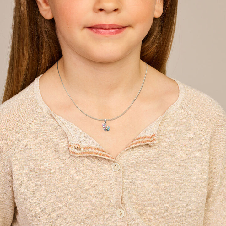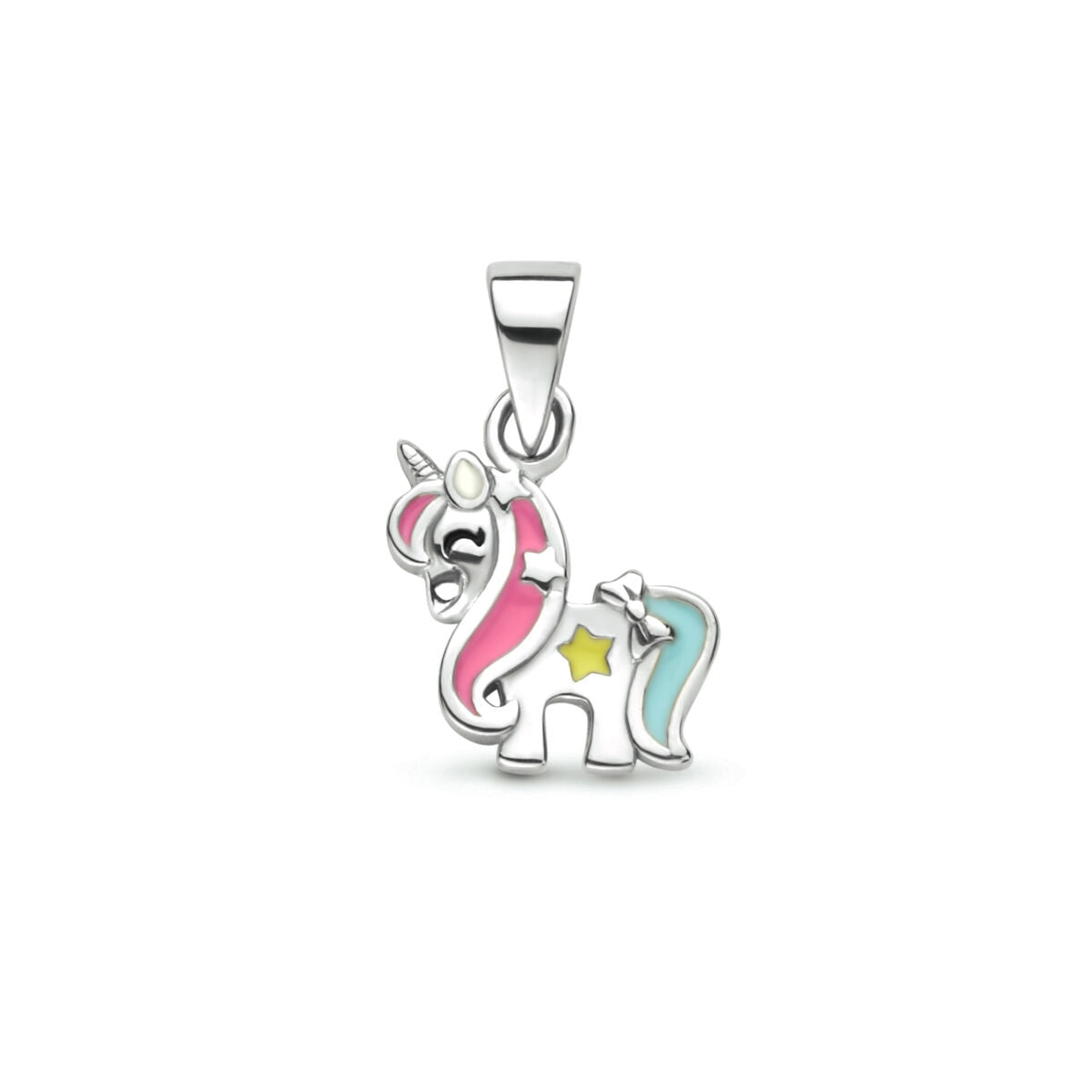 Rhodium-plated 925 silver pendant in the shape of a unicorn with colored enamel. The pendant has a total height of 1.5cm and a width of 10mm.