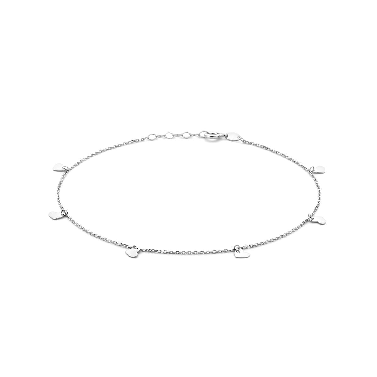 Dit verfijnde enkelbandje is vervaardigd van 925 sterling zilver en afgewerkt met een beschermende rodiumlaag, waardoor het zijn heldere zilverkleurige glans langdurig behoudt. Langs de fijne anker schakels zijn subtiele hartjes geplaatst, elk met een afmeting van circa 5,5 bij 4,5 millimeter. Deze liefdevolle details geven het enkelbandje een zachte, vrouwelijke uitstraling en maken het sieraad bijzonder passend bij romantische momenten, zoals Valentijn, maar ook mooi voor dagelijks dragen.