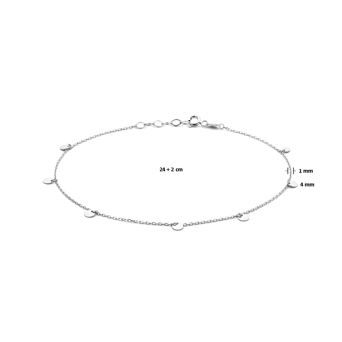 Dit elegante enkelbandje is vervaardigd van 925 sterling zilver en afgewerkt met een duurzame rodiumlaag, die zorgt voor een heldere zilverkleurige glans en extra bescherming tegen verkleuring. Langs de fijne anker schakel zijn subtiele rondjes geplaatst met een diameter van circa 4 millimeter. Deze speelse, ronde elementen geven het enkelbandje een moderne en luchtige uitstraling, perfect voor een verfijnde zomerse look.