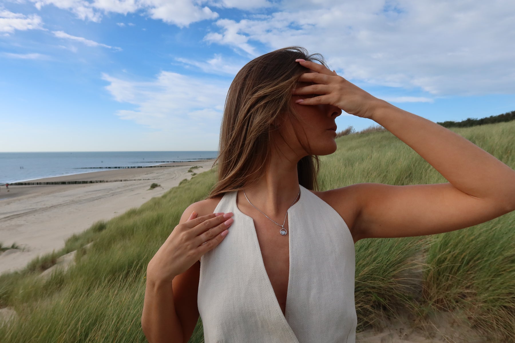 Een vrouw in een mouwloze witte jurk staat in het hoge gras bij het strand, draagt het Amélie AsHanger massief van Juwelier van der Kooij, met één hand op haar borst en de andere haar gezicht beschermend onder een gedeeltelijk bewolkte hemel.