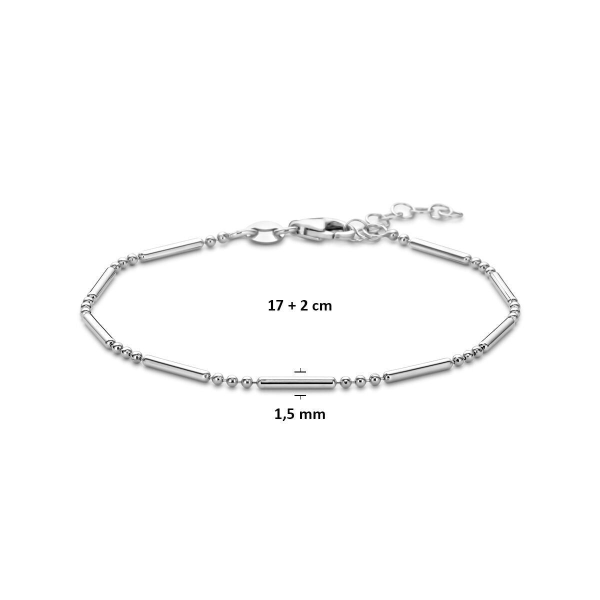 Deze verfijnde armband is vervaardigd uit 925 gerhodineerd zilver en heeft een elegante schakeling van subtiele bolletjes en staafjes. Met een schakelbreedte van 1,5 mm oogt het ontwerp delicaat en sierlijk, ideaal om solo te dragen of te combineren met andere zilveren dames armbanden voor een speelse gelaagde look.