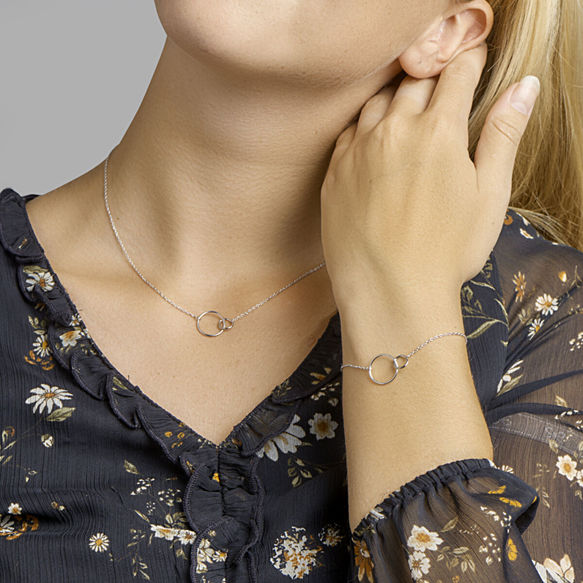 Rhodium-plated silver bracelet with open circles. The length is 16cm with 2.5cm extension and the link width is 1.2mm.