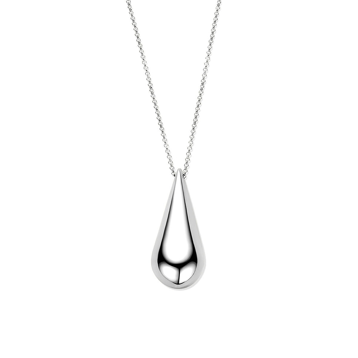 Minimalisme met karakter – dit zilveren collier van gerhodineerd 925 zilver is verfijnd in vorm en opvallend in elegantie. De sierlijke druppelvormige hanger van 19,5 mm breed en 50 mm hoog vormt het stralende middelpunt, met een vloeiend lijnenspel dat symbool staat voor zachtheid en elegantie.