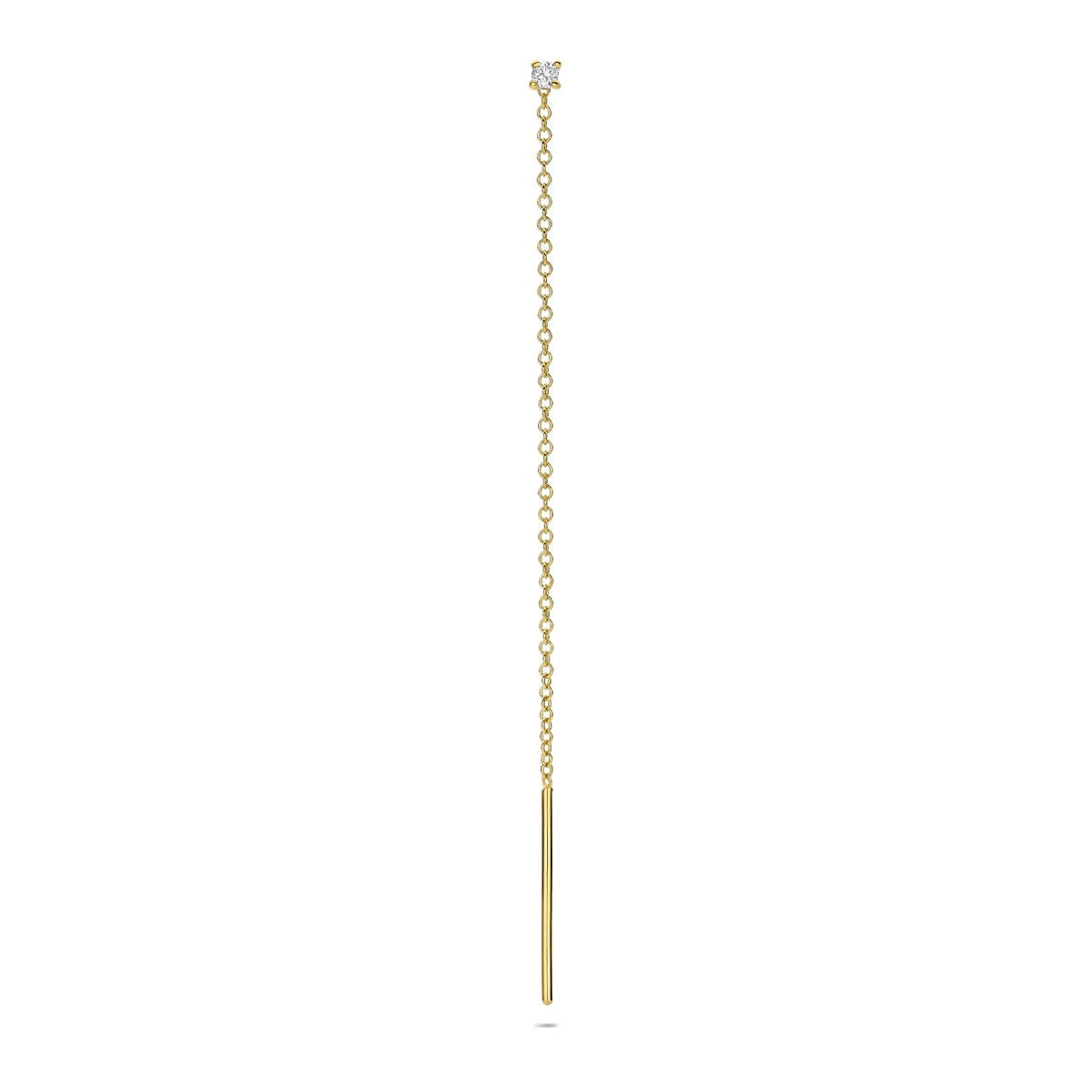 Deze 14k geelgouden doortrekoorbel is het toonbeeld van subtiele luxe. Met zijn elegante lengte van 7 cm en een verfijnde breedte van 1,3 mm glijdt het fijne kettinkje moeiteloos door het oor, waarbij het zacht meebeweegt met elke beweging. Aan het uiteinde schittert een briljant geslepen diamant van 0.03 ct, met een zuiverheid van SI1 en een diameter van 2 mm, klassiek gezet in een 4-poots chatonzetting.