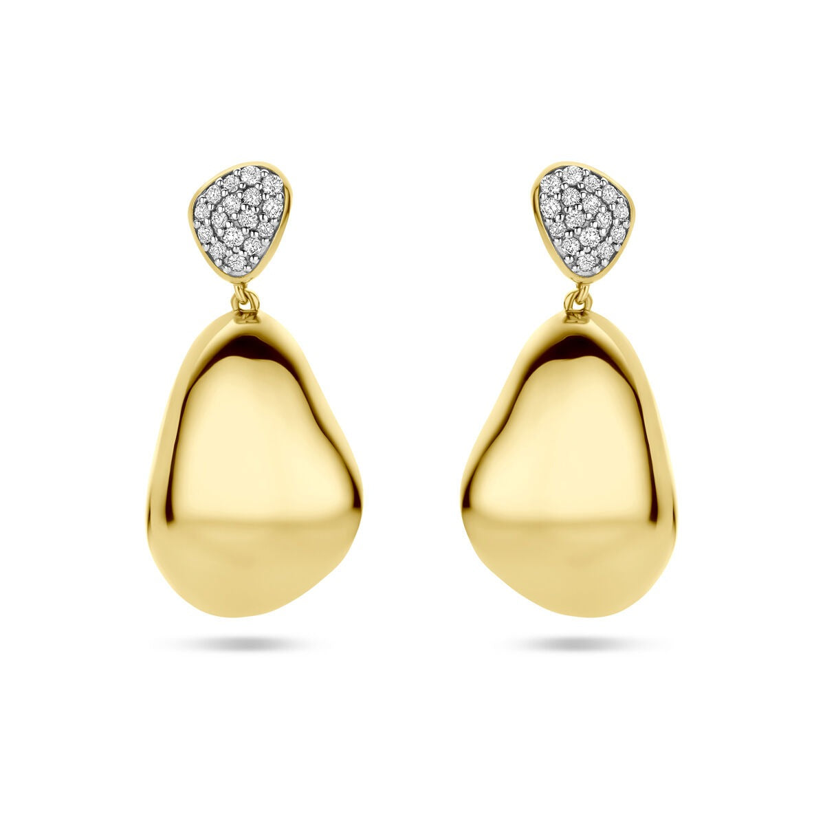 Het warme geelgoud vormt een prachtig contrast met het heldere wit van de diamanten, wat deze oorhangers tot een stijlvol accessoire maakt voor zowel dagelijks gebruik als bijzondere gelegenheden. De brede basis van 13,5 mm geeft het ontwerp een moderne en krachtige uitstraling, terwijl de poussette-sluiting zorgt voor comfort en veiligheid.