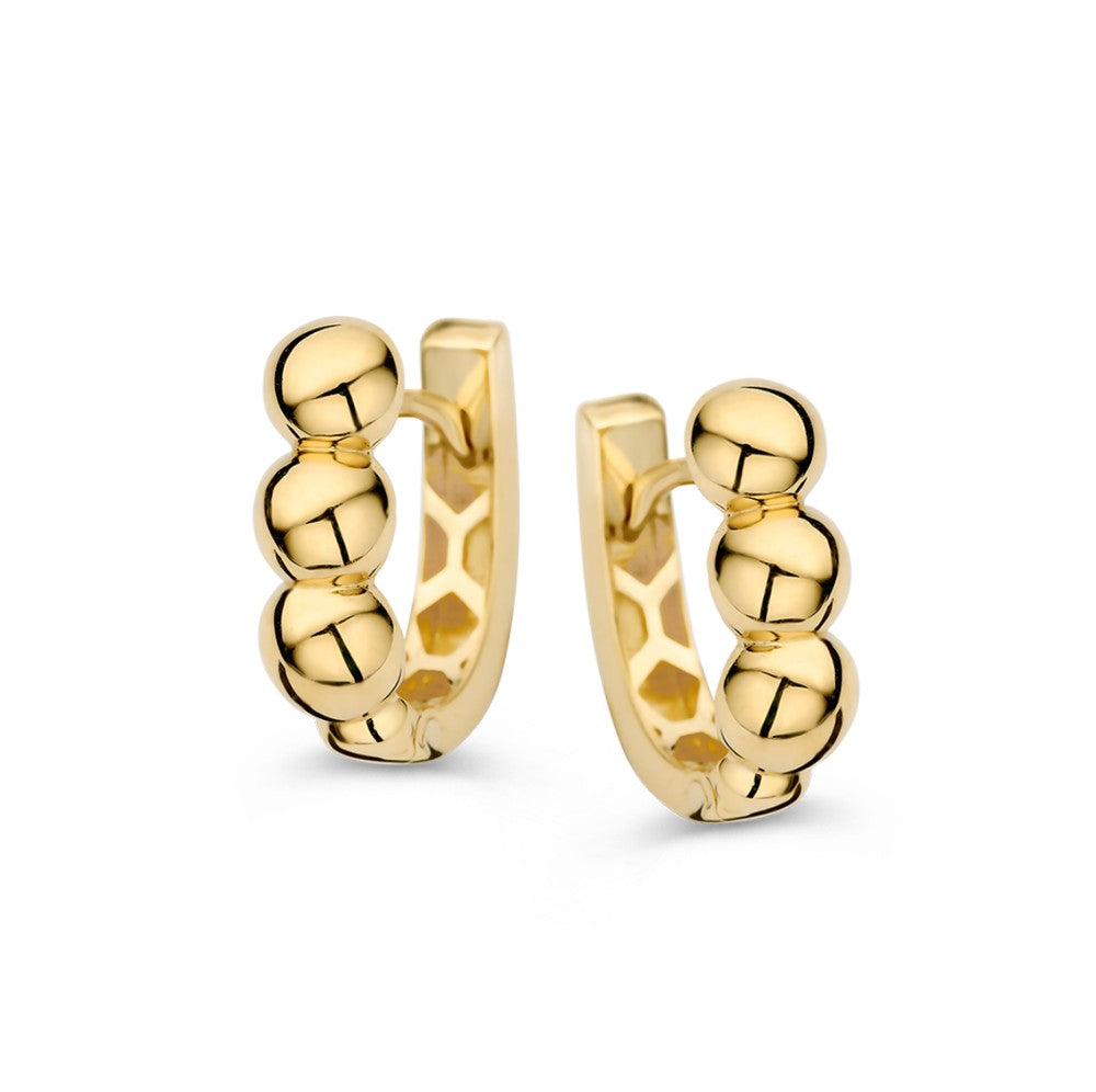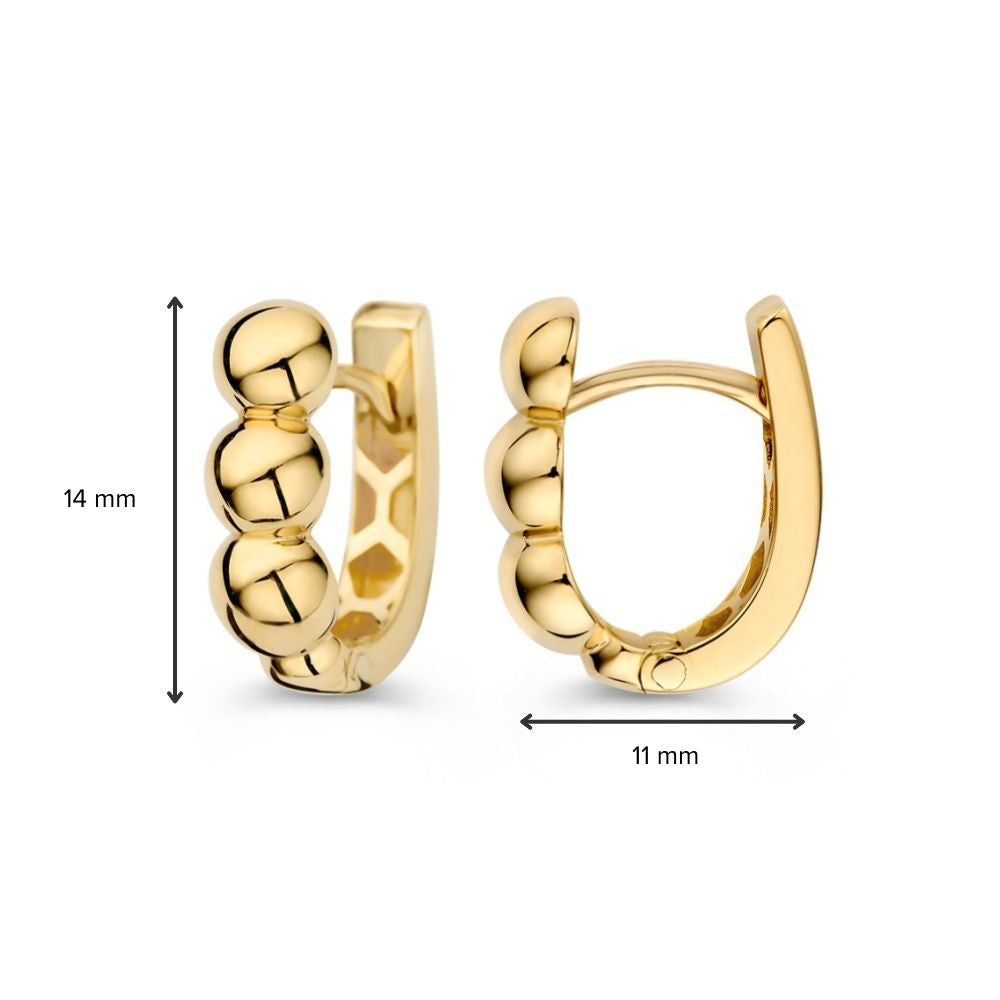 Opvallende, gouden oorringen aan de voorzijde bewerkt met een bolletjespatroon.