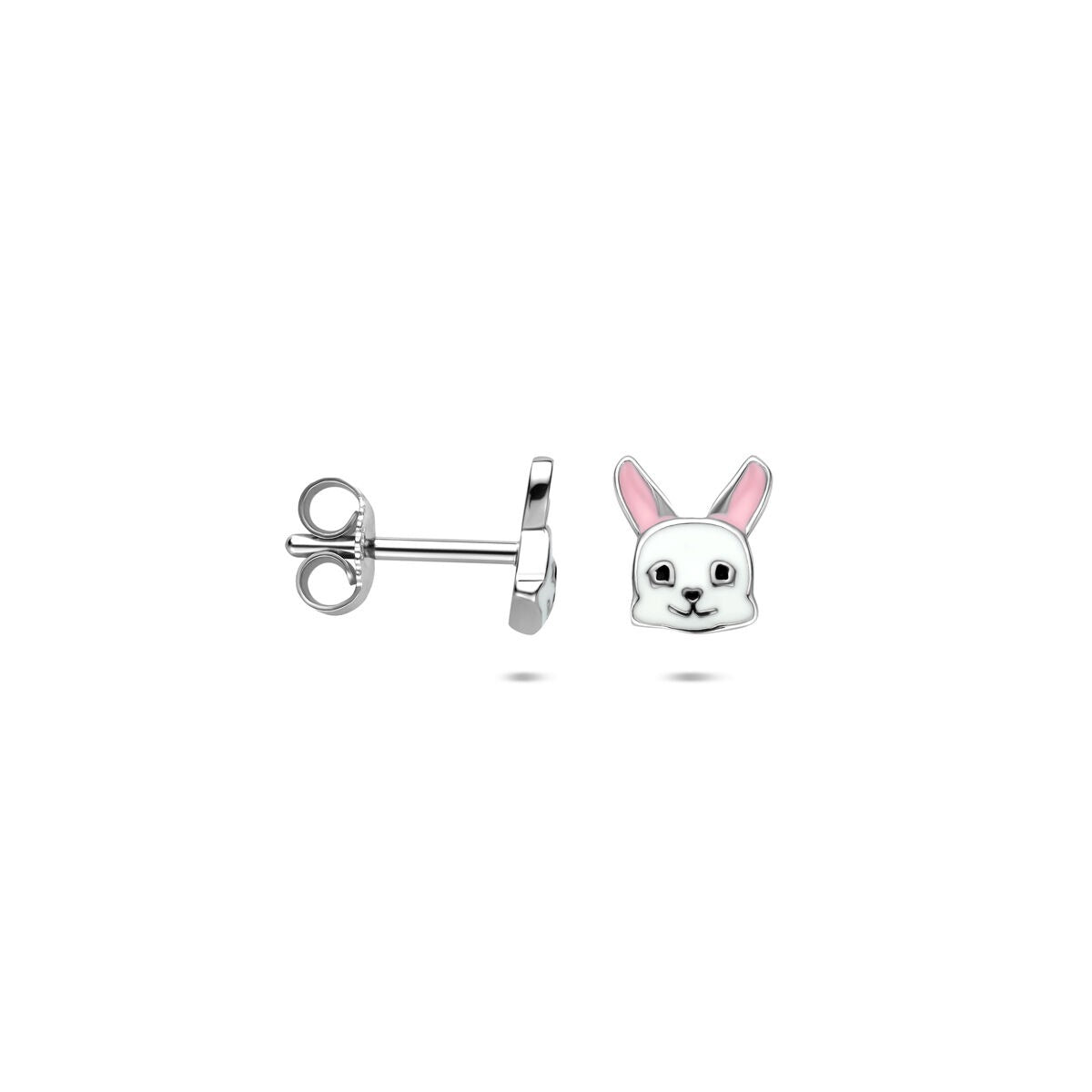 Zilveren kinder oorknoppen met emaille konijn – gerhodineerd