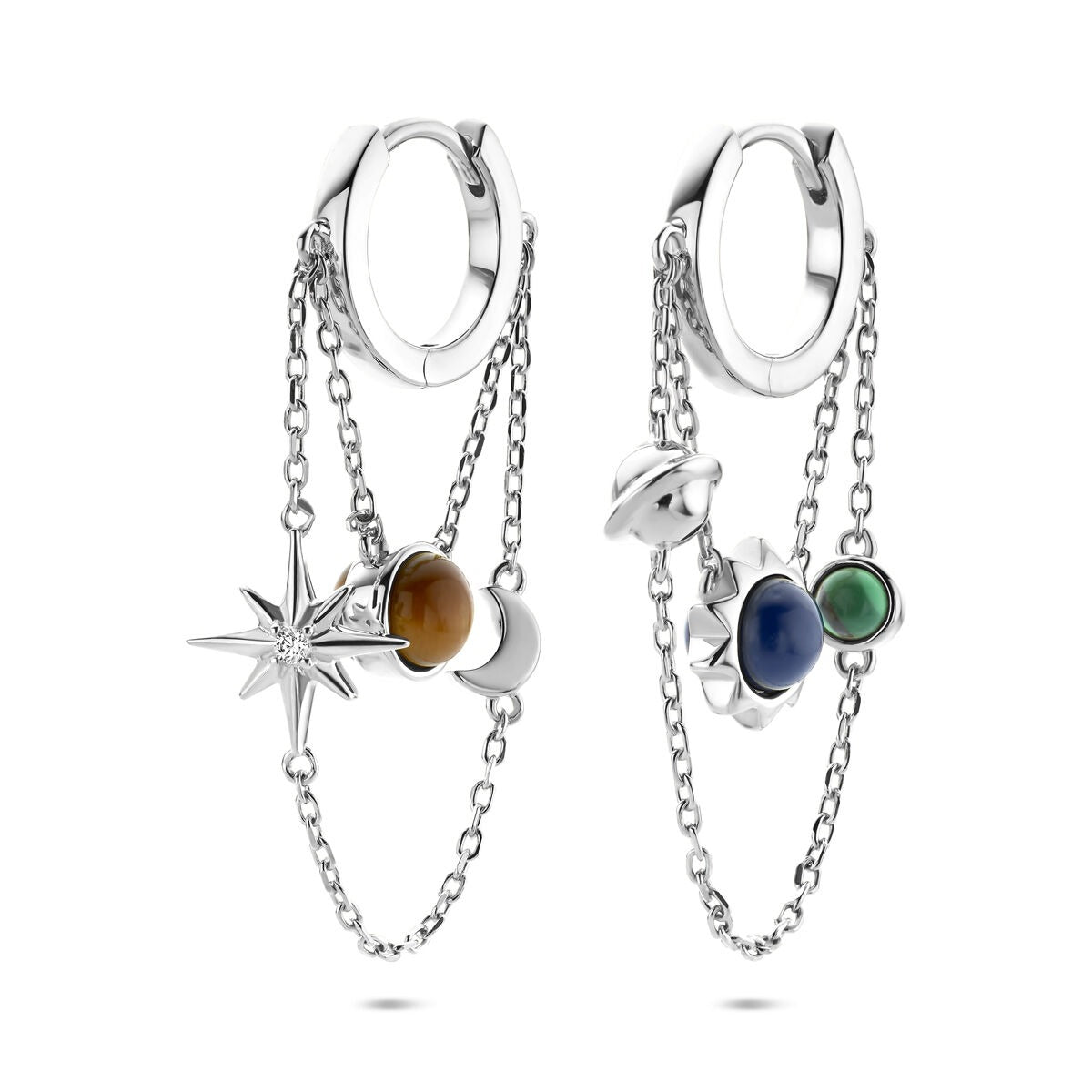 Zilveren klapoorringen met lapis, tijgeroog en malachiet – gerhodineerd