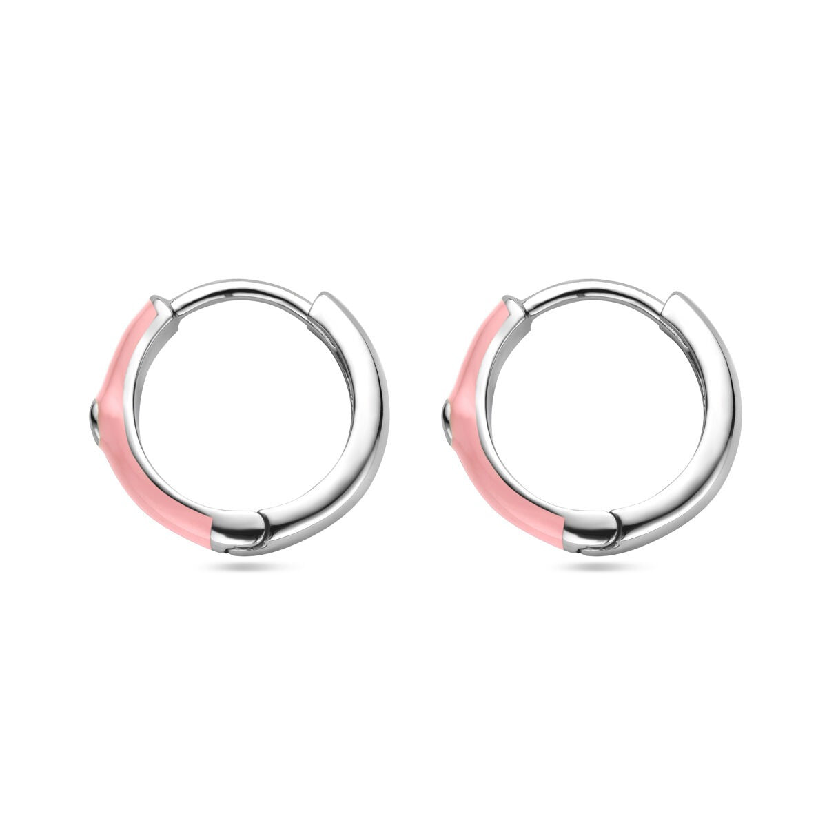 Rhodium-plated 925 silver drop earrings with zirconia and pink enamel. The drop earrings measure 15x2.5mm.