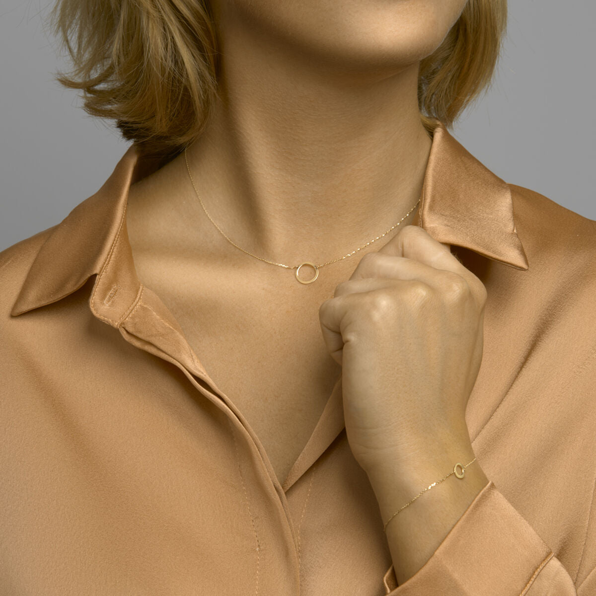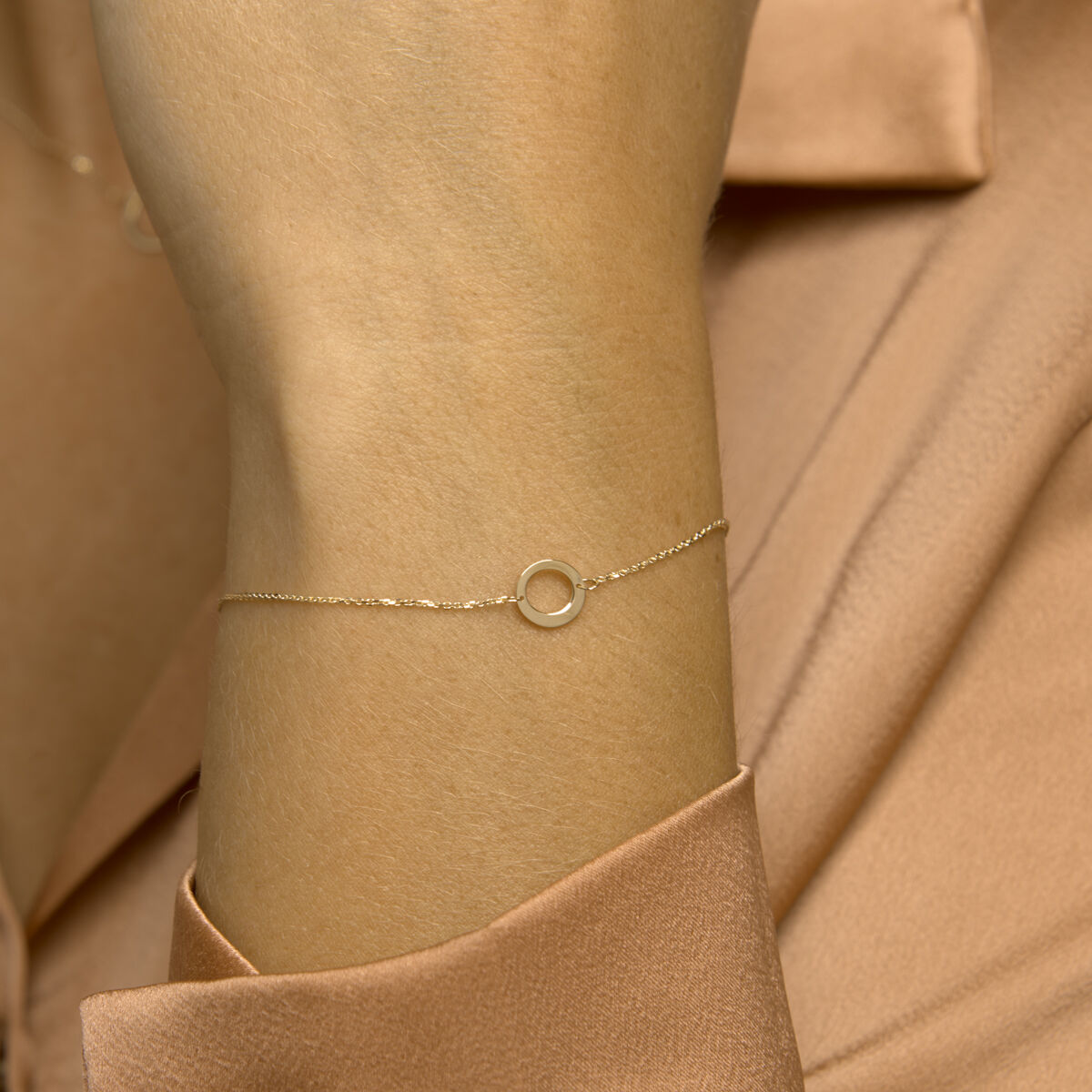 14k yellow gold bracelet with a circle. The bracelet has wearing lengths of 16.5, 17.5 and 18.5 cm. The circle has a diameter of 8mm. The link width is 0.8mm.