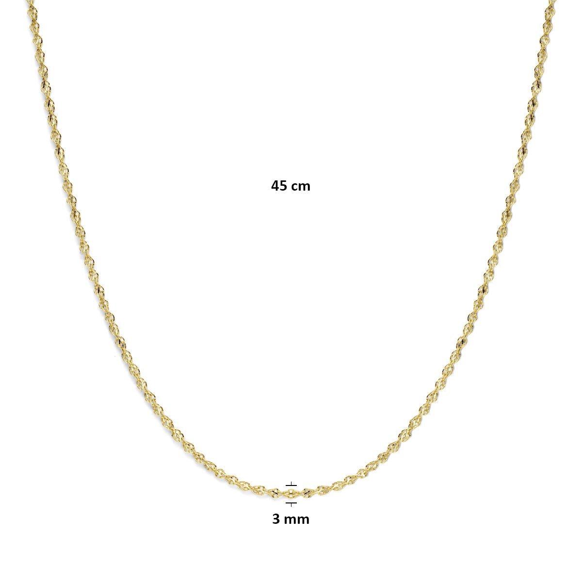 Deze elegante gouden ketting is een verfijnde combinatie van luxe en duurzaamheid. Vervaardigd uit 14 karaat geelgoud met een kern van massief 925 zilver (Silgold), straalt dit collier de warme glans van goud uit met de stevigheid van zilver als basis. Het resultaat is een hoogwaardig sieraad dat licht aanvoelt, maar toch uitzonderlijk robuust is.
