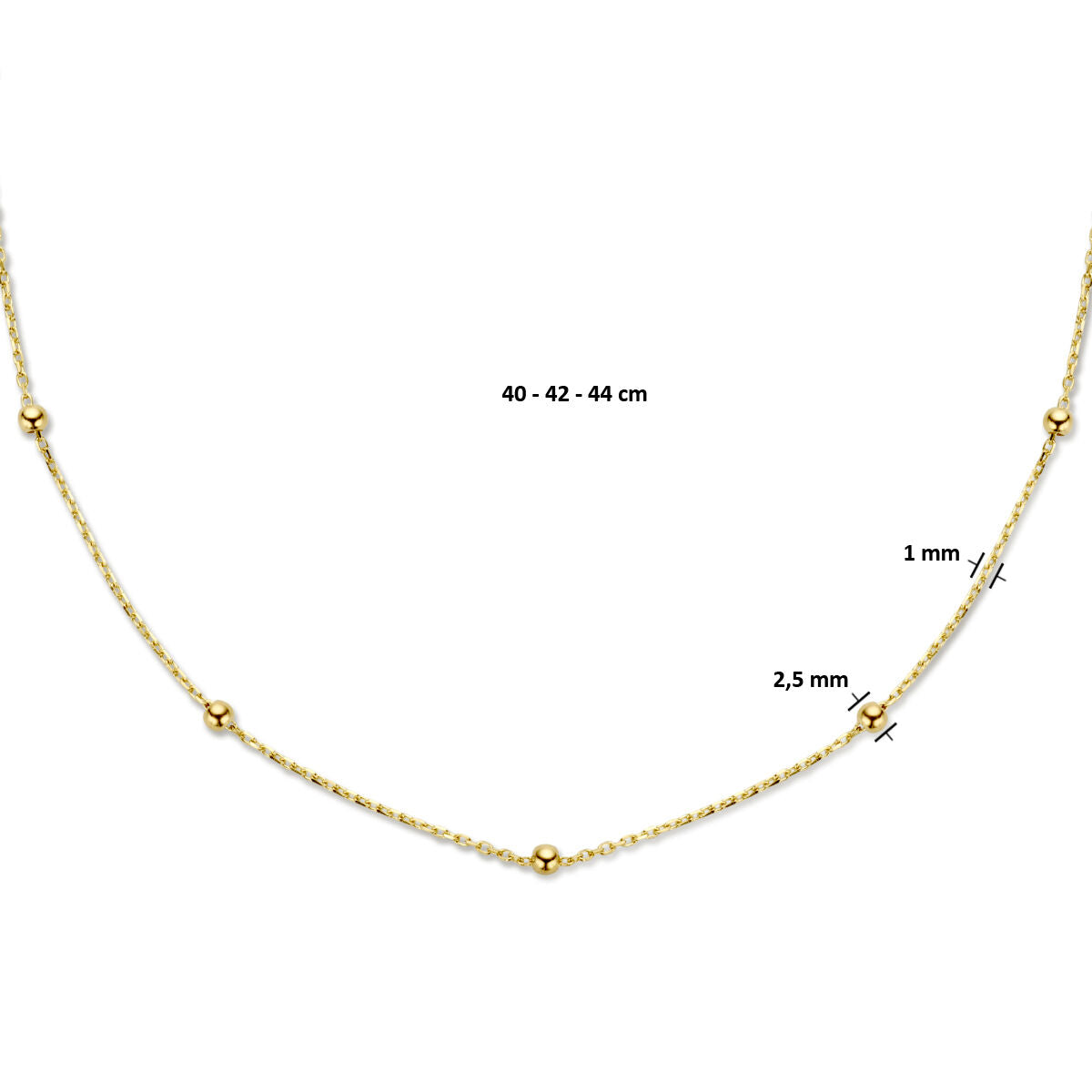 14k yellow gold necklace with an anchor link and 2.5mm balls. The necklace has wearing lengths of 40, 42 and 44cm. The link width is 1.0mm.
