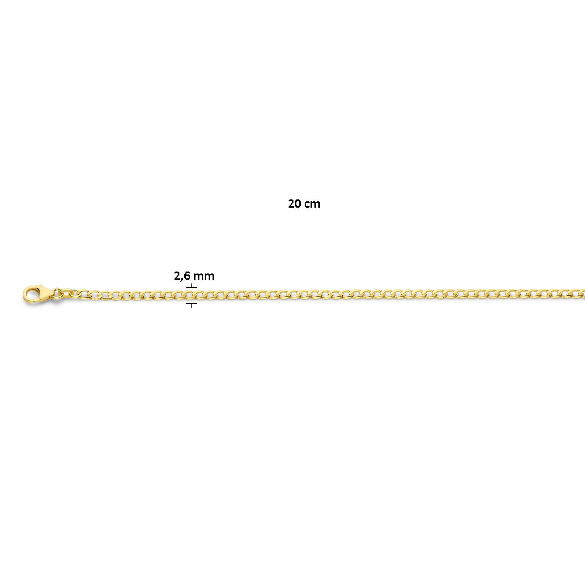 De Van der Kooij Collectie gourmette 6-zijdes geslepen 2,6 mm 14K geelgoud armband is plat neergelegd afgebeeld, is 20 cm lang en 2,6 mm breed, en heeft een karabijn sluiting aan één uiteinde.