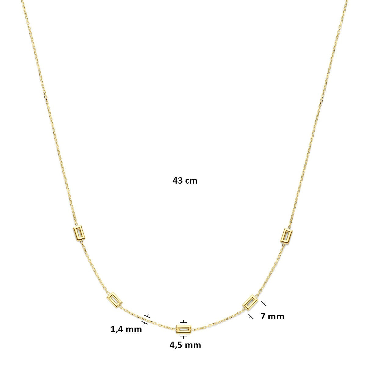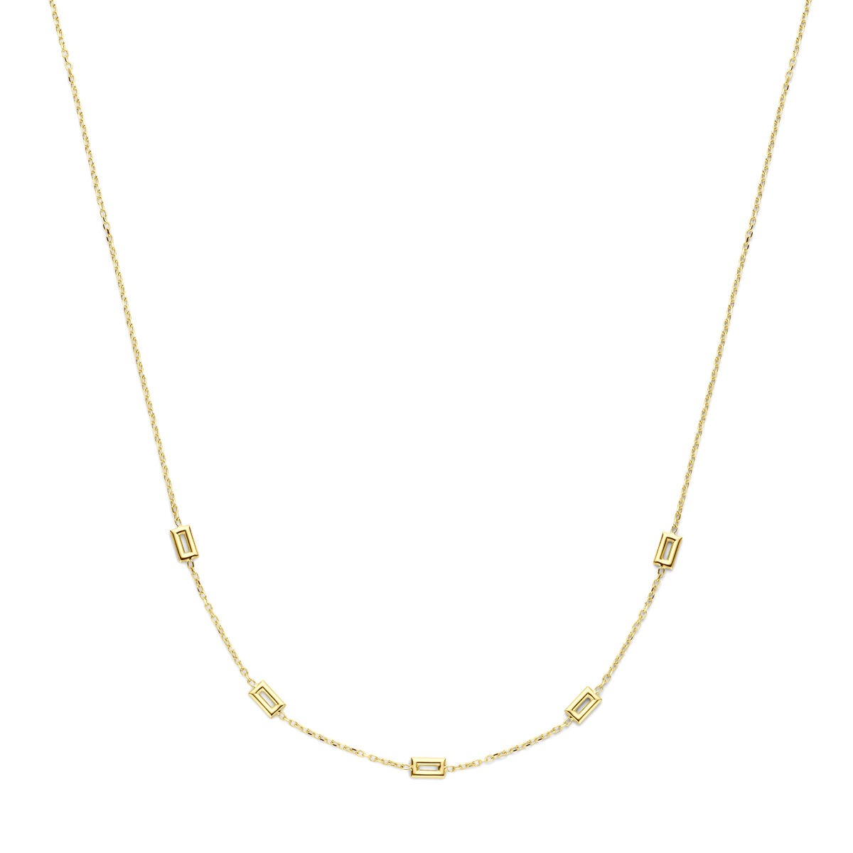 Deze 14 karaat geelgouden dames ketting is een verfijnde toevoeging aan elke sieradencollectie. Het collier is opgebouwd uit sierlijke, aparte tussenstukken die een speels ritme creëren in het ontwerp. De schakelbreedte van 1,4 mm geeft de ketting een subtiele uitstraling, terwijl de totale breedte van de decoratieve elementen 4,5 mm meet – perfect in balans voor een elegante, luchtige look.