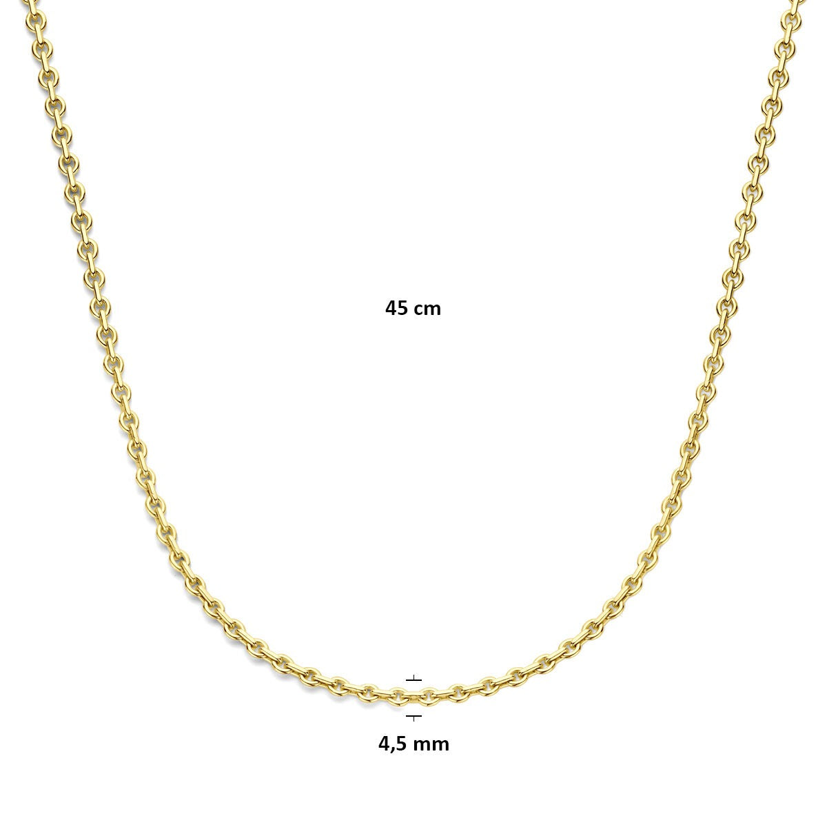 Met een draaglengte van 45 cm en een breedte van 4,5 mm heeft de ketting een elegante, subtiele aanwezigheid. De klassieke anker-schakel zorgt voor een verfijnde uitstraling, terwijl de stevige karabijnsluiting zorgt voor comfort en veiligheid tijdens het dragen.
